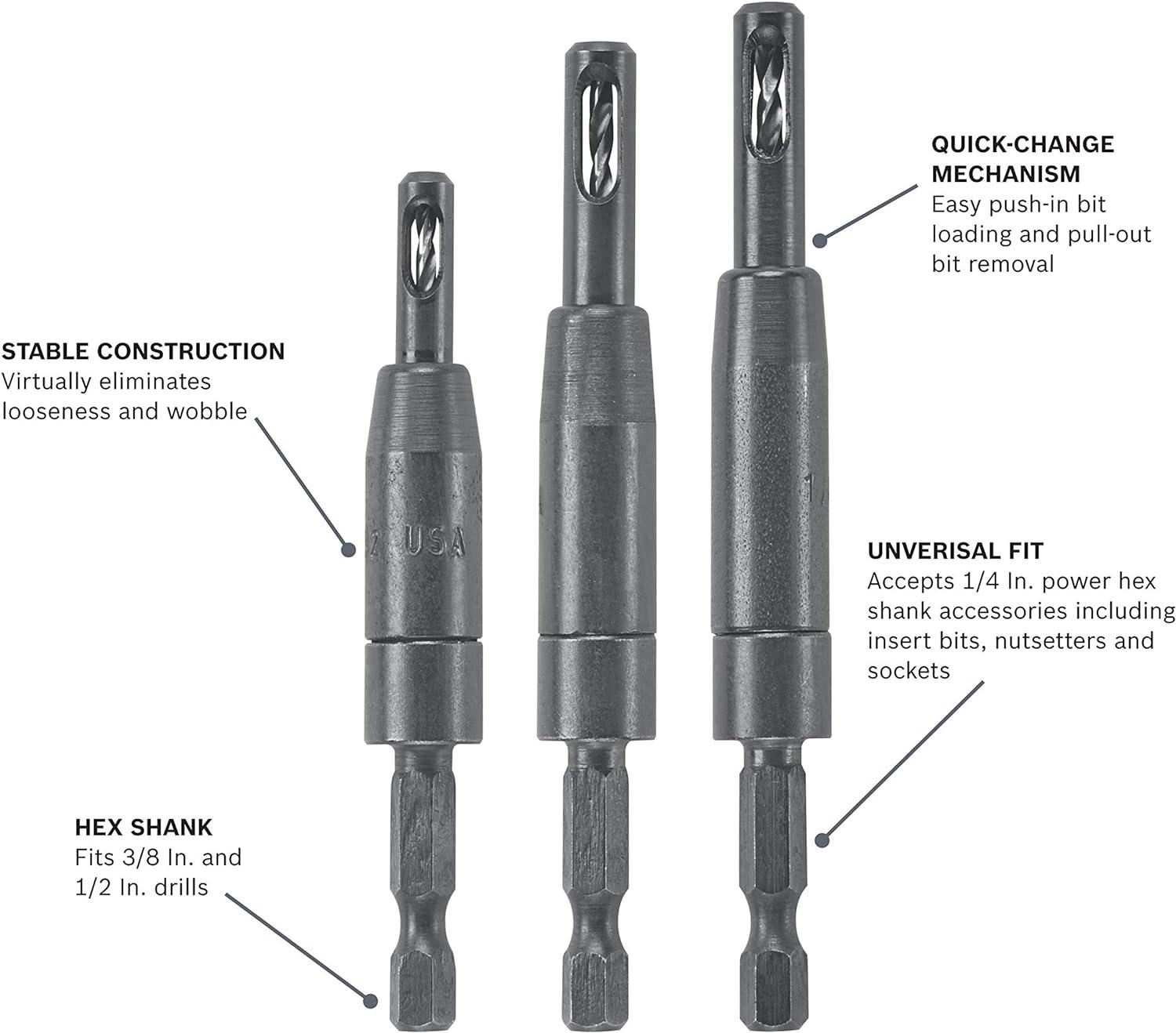 BOSCH Self-Centering Hinge Drill Bits are ideal for cabinet and door hinge installation, and other precision woodworking applications. They feature a spring loaded self-centering guide that accurately centers the bit for drilling straight and consistent holes.