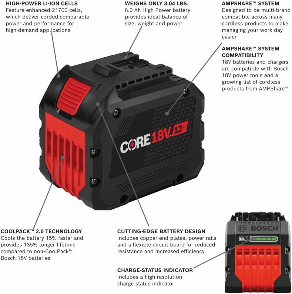 Bosch GBA18V60-2PK 18V CORE18V® Lithium-Ion 6 Ah High Power Battery, 2-Pack(1-Pack w/ Fast Charger)
