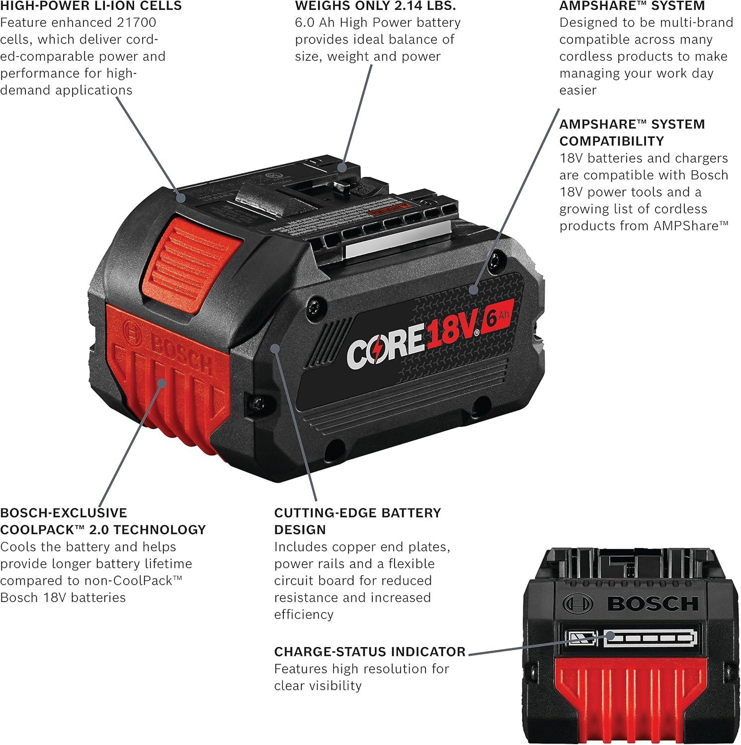 Bosch GBA18V60-2PK 18V CORE18V® Lithium-Ion 6 Ah High Power Battery, 2-Pack(2-Pack w/ Fast Charger)