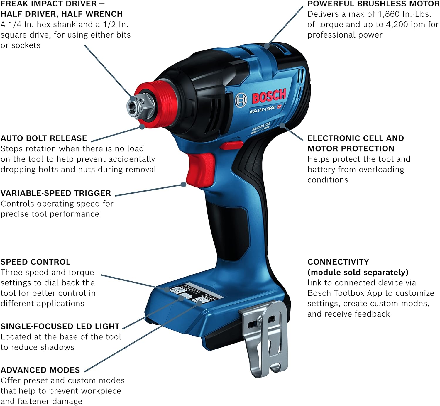 This Bosch D-handle Bulldog™ hammer consistently outperforms the best-selling 1 In. corded 11255VSR Bulldog™, making it better than the best. The GBH18V-26D 18V Brushless 1 In. SDS-plus® Bulldog™ Rotary Hammer delivers 1.9 Ft.-Lbs. of impact energy, based on the industry standard of measurement agreed upon by the European Power Tool Association (EPTA). It weighs only 5.8 Lbs. (tool only, not including battery), delivering superior performance and an outstanding impact-to-weight ratio. The efficient brushless motor combined with a CORE18V battery helps provide greater productivity and maximized runtime. The kit includes two CORE18V 4.0 Ah Compact Batteries, which deliver lightweight, high power, and are equipped with CoolPack technology for extended life. The tool features a jobsite-proven D-handle design with soft-grip and is ideal for overhead, horizontal and downward drilling applications. It also has KickBack Control, an integrated sensor to stop tool rotation in bind-up situations. The hammer features a variable-speed reversing trigger for accurate bit starting.