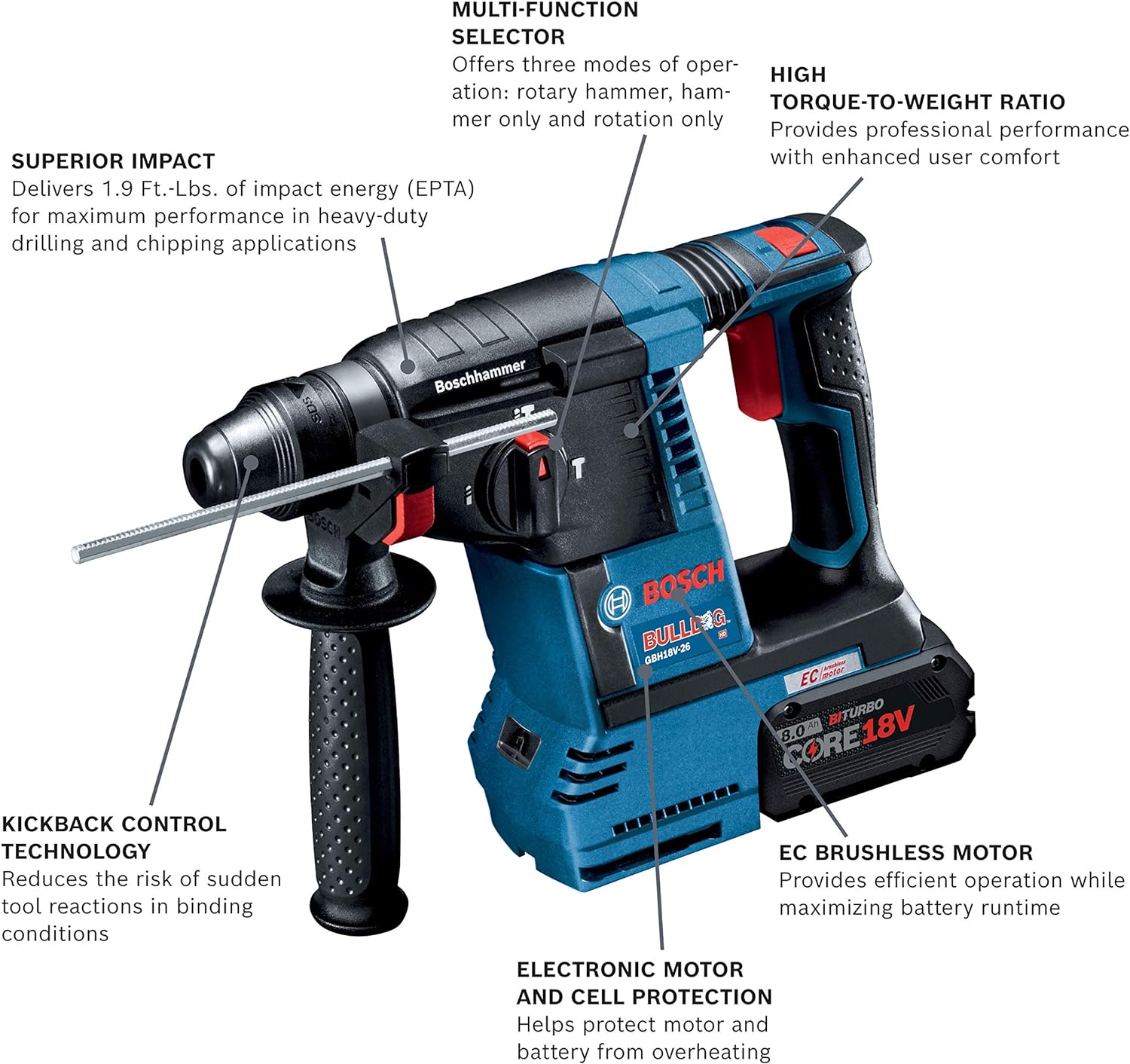 superior impact – delivers 1.9 ft.-lbs. of impact energy (epta) for heavy-duty drilling and chipping applications in concrete