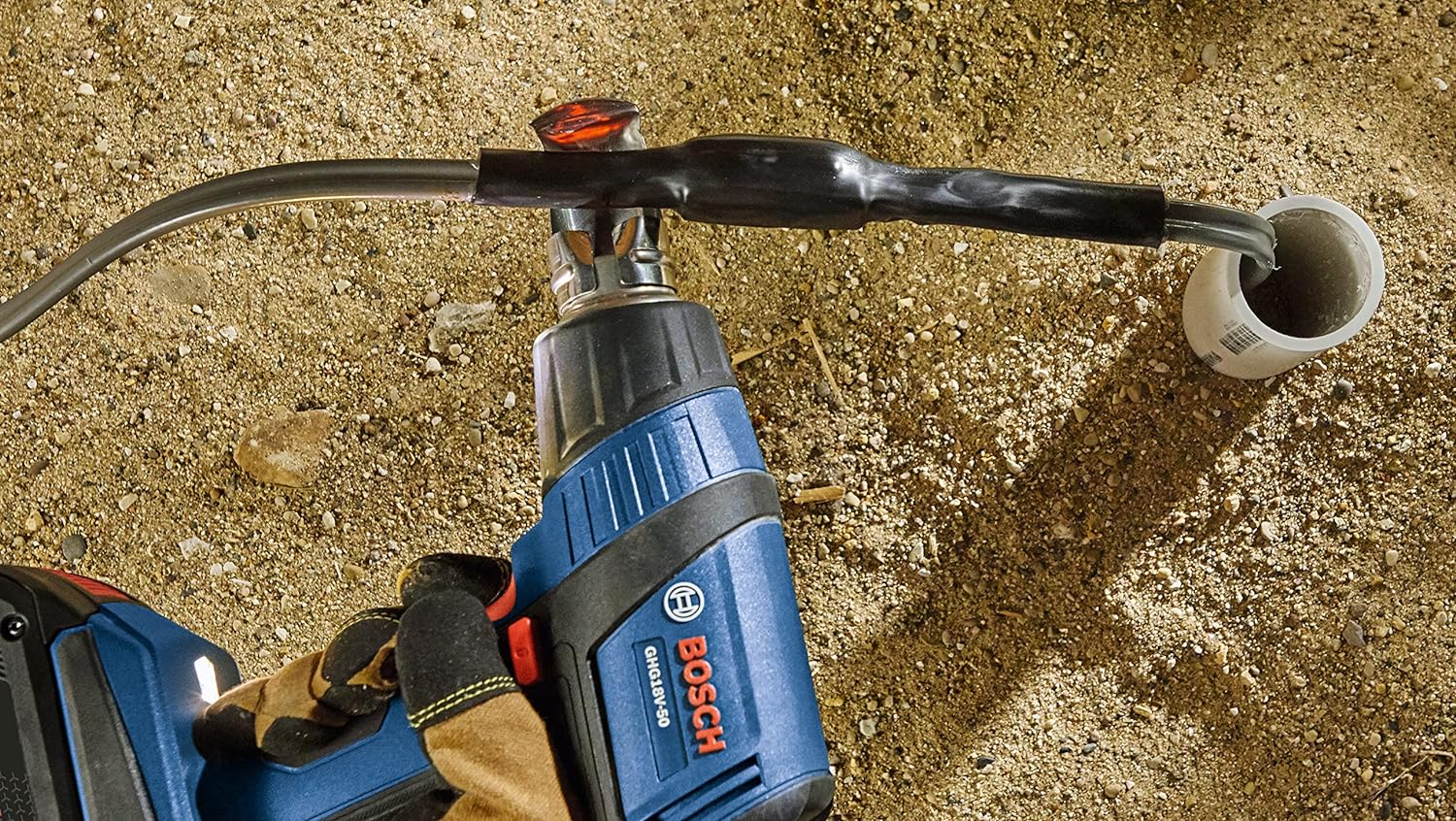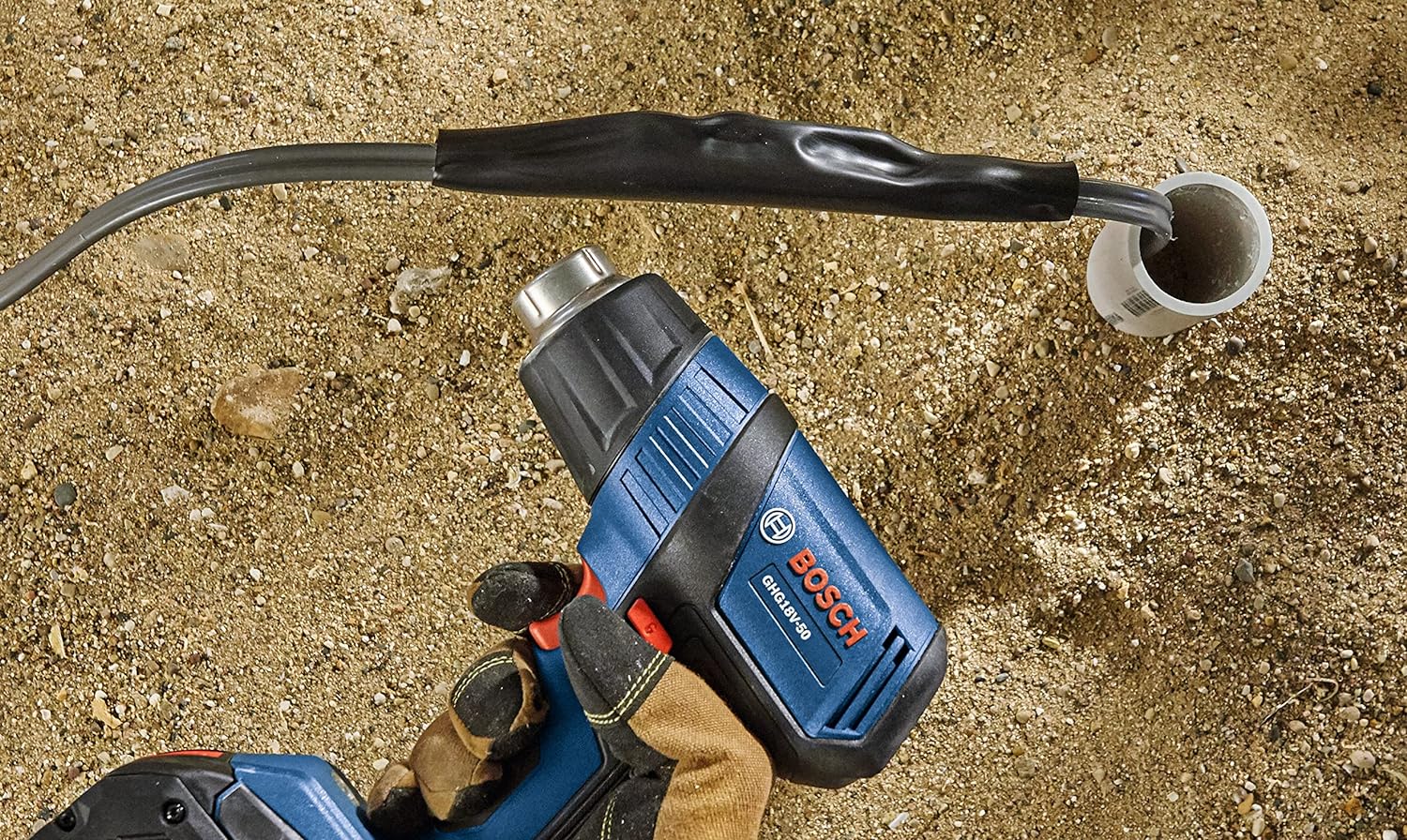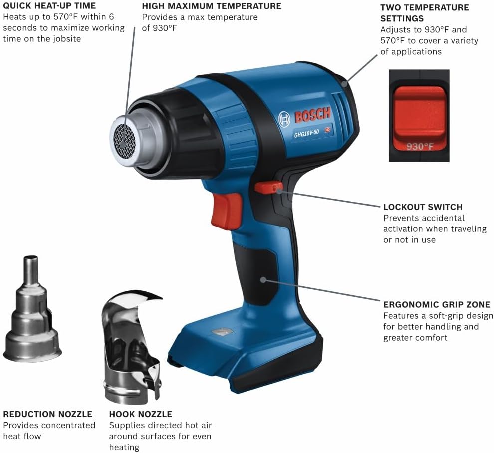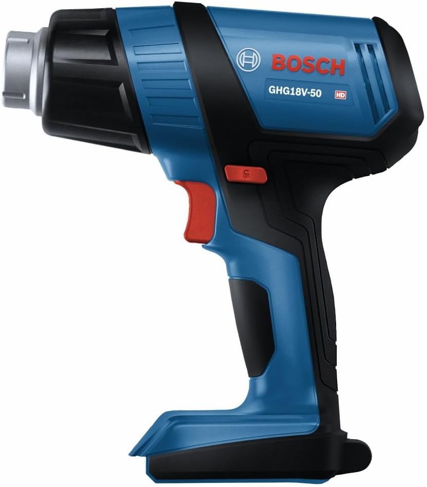 The Bosch GHG18V-50 18V Heat Gun delivers fast heat-up time, heating up to 570°F within six seconds to maximize working time on the jobsite. It features a reduction nozzle, which provides concentrated heat flow. It also has a hook nozzle, which supplies directed hot air around surfaces for even heating. It has two temperature settings – 930°F and 570°F – to cover a variety of applications. When paired with the CORE18V® 8 Ah battery it provides a runtime of up to 21 minutes at 570°F. It provides a max airflow rate of 175 liters per minute for efficient heating. The heat gun features an LED worklight, a lockout switch to help prevent accidental activation and an ergonomic grip zone. This heat gun is ideal for electricians, automotive technicians and others for heat-shrinking wires, removing labels, softening adhesives, bending plastic pipes and more.