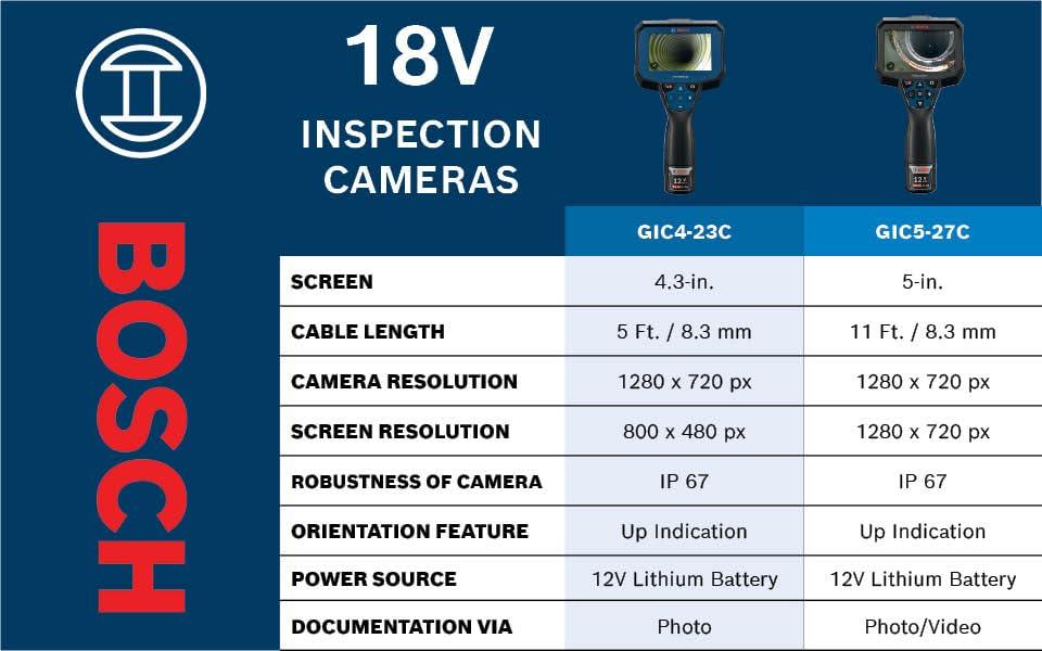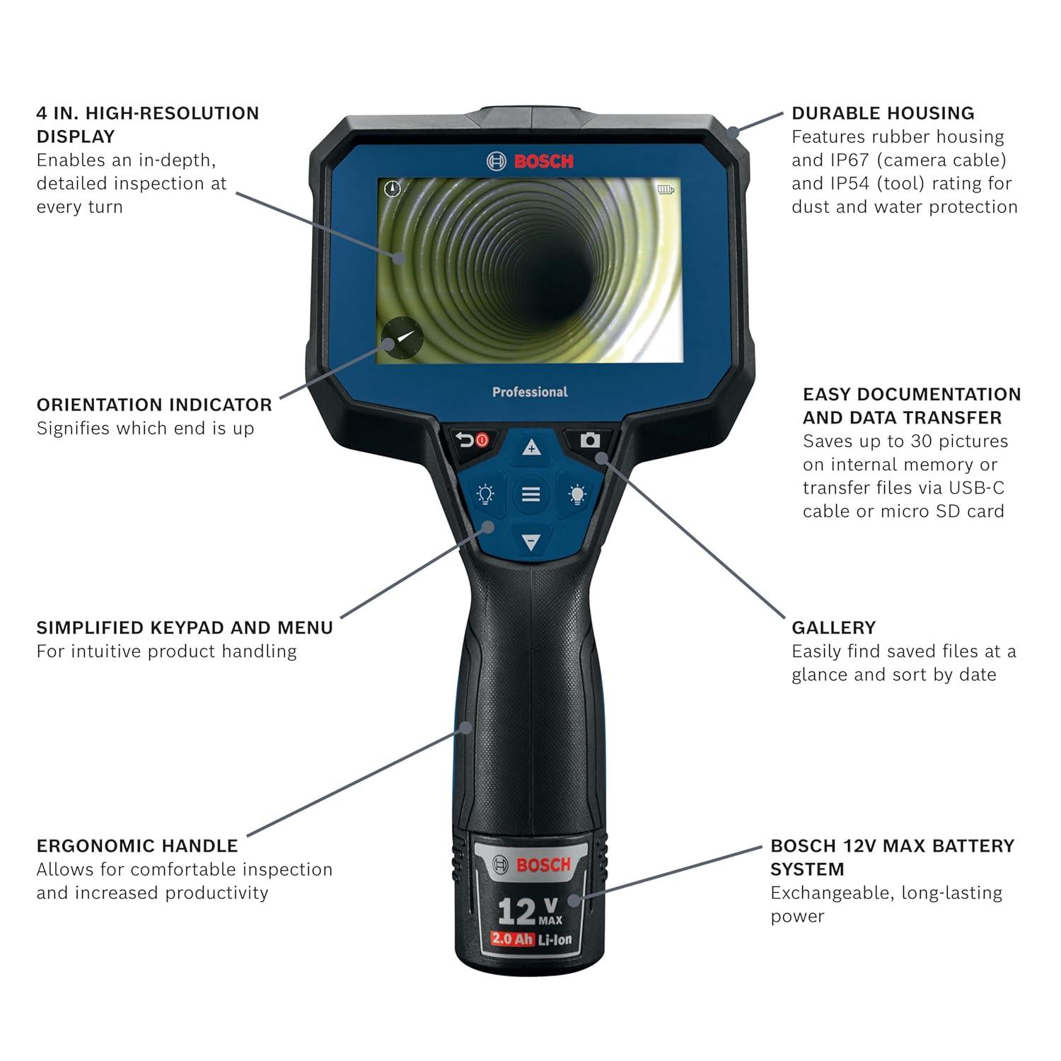BOSCH 12V BATTERY PLATFORM: The inspection camera runs on the Bosch 12V Max battery system for exchangeable, long-lasting power. The 12V battery is compatible with all Bosch 12V products including thermal cameras, lasers, wall scanners, and more.