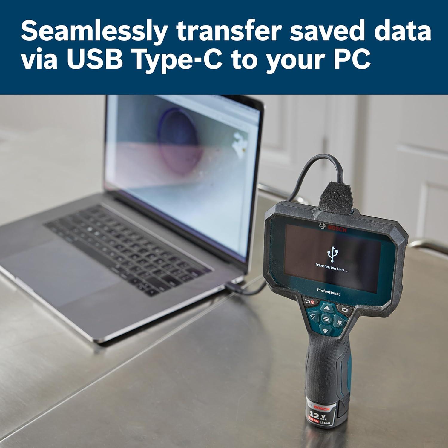 The Bosch GIC4-23C 12V Max Connected 5 Ft. Handheld Inspection Camera features a high-resolution, easy-to-see 4 In. display, assuring an in-depth, detailed inspection at every turn. The 5 Ft. camera cable helps navigate tight spaces on the jobsite. Like a compass, the tool comes equipped with an up indicator to signify which end is up. Easy to use, the keypad and menu are designed for intuitive product handling, with simple, clearly marked buttons to adjust the camera view and lighting. Documentation is important and the camera’s ability to capture photos aids in report creation and further analysis. With the featured integrated connectivity, transfer files easily via the included USB-C cable and view them at a glance in the gallery. Built for comfort, the device’s ergonomic handle minimizes hand fatigue for longer inspection durations. The rubber housing combined with IP67 (camera cable) and IP54 (tool, does not include battery and battery compartment) rating offer enhanced protection on the job. The inspection camera is efficiently powered by the Bosch 12V Max battery system for long-lasting reliability.