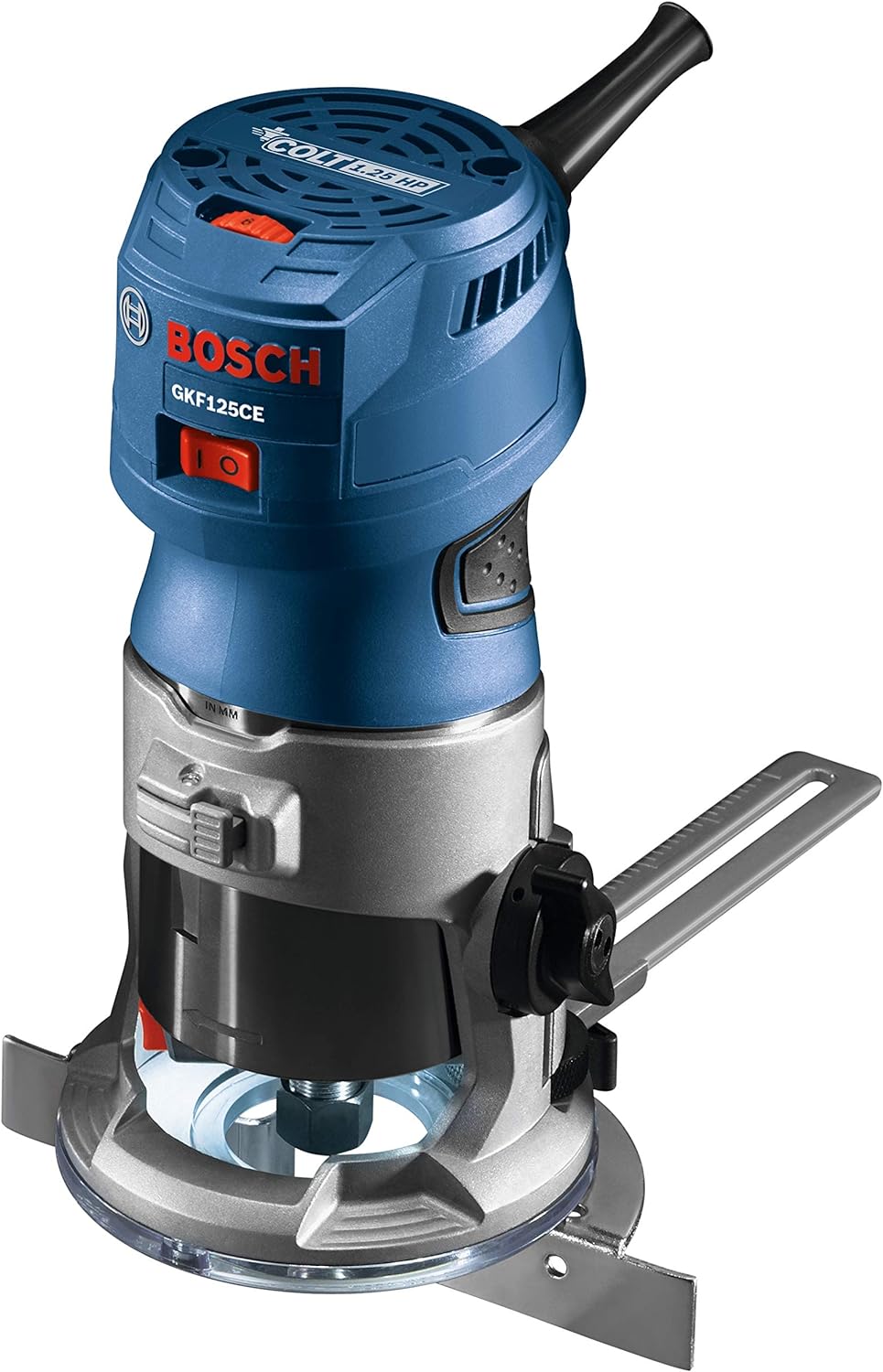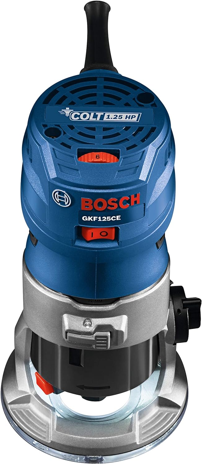 The Bosch GKF125CE Colt variable-speed palm-grip router with 1.25 horsepower (max) lets you feel the power in your hand. The GKF125CE has an ergonomic palm-grip design with soft-grip to make it very comfortable to hold, making it typically more convenient to use than larger routers. But it also has ample power, with a 1.25 HP (max) rating. It's far more than a laminate trimmer, as it is the ideal tool for rounding-over deck planks and railings, hinge mortising, decorative edge forming, slot cutting, window cutouts, decorative inlays, laminate trimming and more. The motor features soft-start circuitry, a variable-speed dial and Constant Response circuitry to maintain speed under load. Its PR101 fixed base features macro- and micro-fine depth adjustment and a centerable round subbase for easy guidance. The GKF125CEK Colt Palm Router Kit includes straight-edge guide is included that can guide the bit up to 3-5/8 In. in from the edge of workpiece, plus a carrying case.