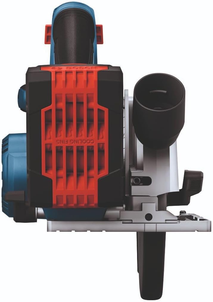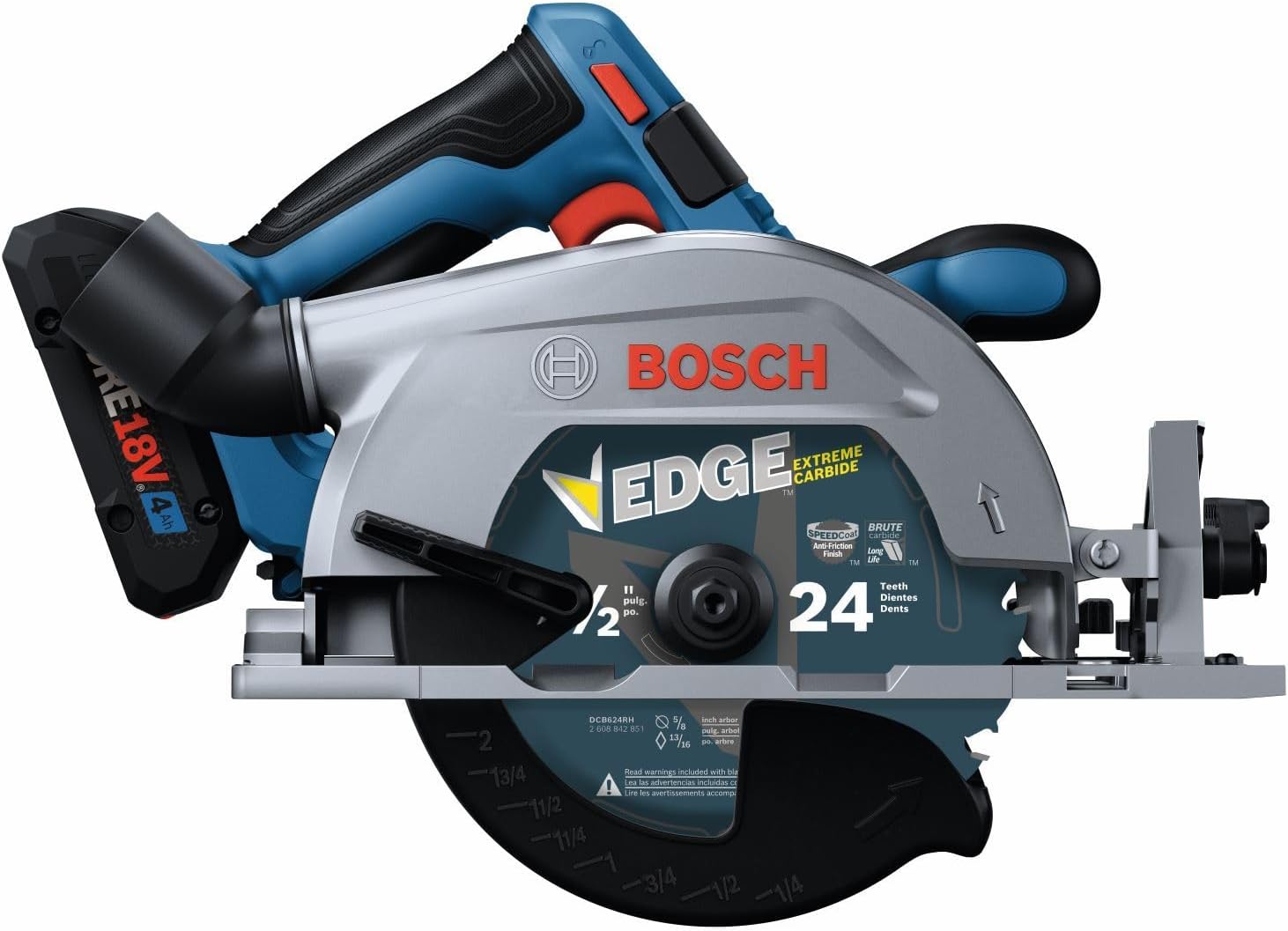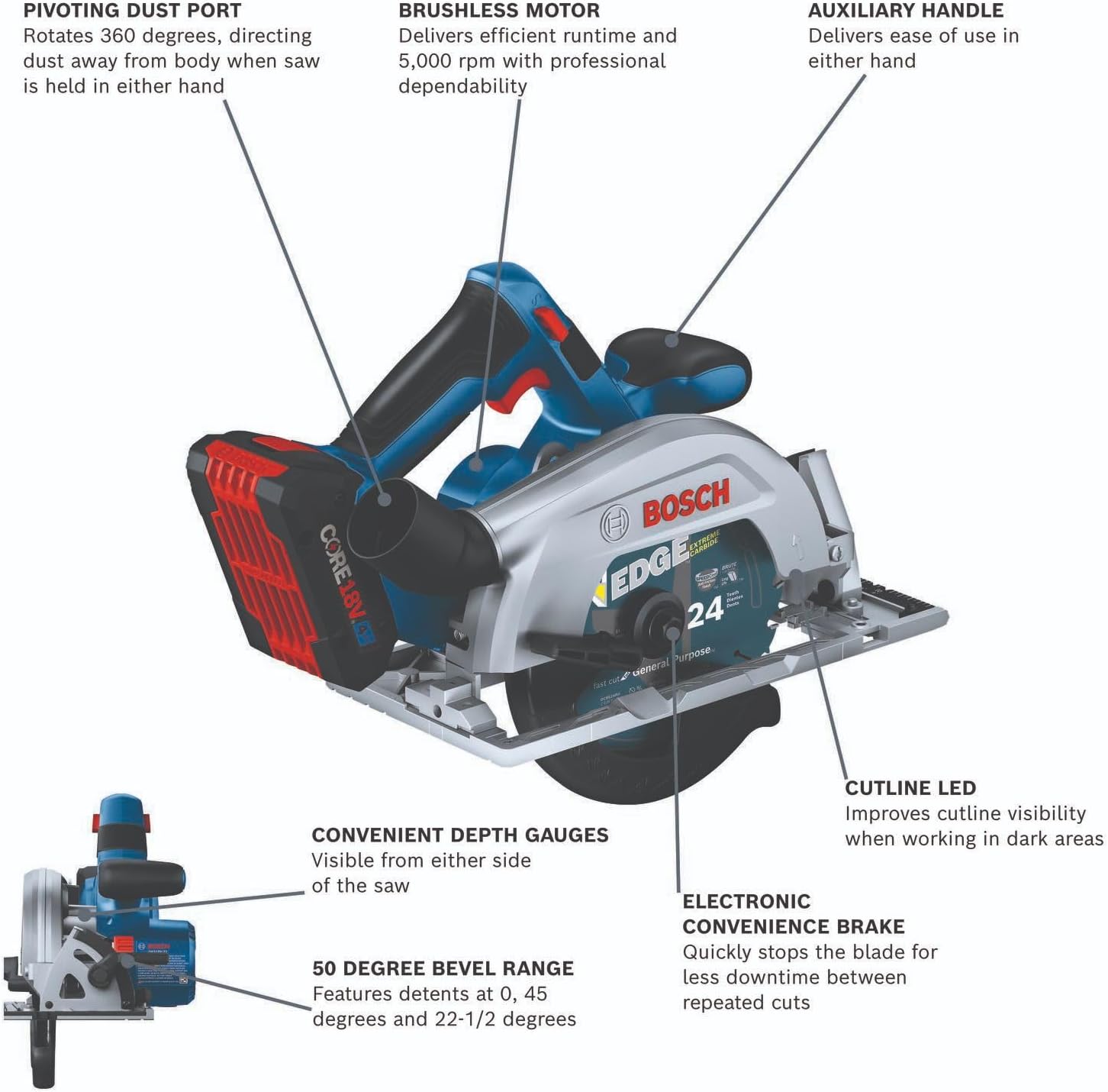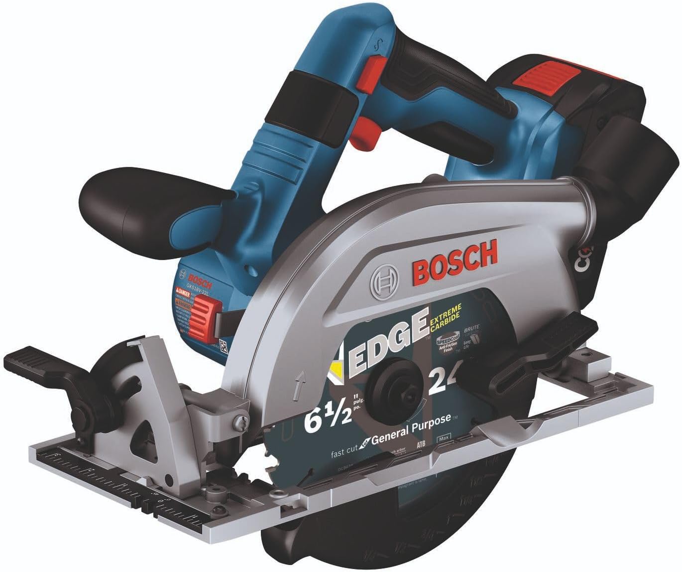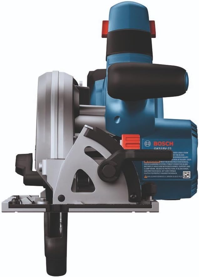 This circular saw has a 2-1/4 In. cut capacity, cutting through 2X (“two by”) material across the entire bevel range. The Bosch GKS18V-22 18V 6-1/2 In. Blade-Right Circular Saw has a brushless motor, which delivers efficient runtime and 5,000 rpm with professional dependability. This compact saw weighs only 6.1 Lbs. (tool only, not including battery). The auxiliary handle improves stability and ergonomic handling in either hand. The saw's convenient depth gauges are visible from either side of the saw and it has a 0-50 degree bevel range, with detents at 0, 45 and 22-1/2 degrees. It features two convenient depth gauges, one on the lower guard and one by the housing so depth is visible on either side of the saw. It has an electronic convenience brake for less downtime between cuts. The 360 degree pivoting dust port directs dust away from the body when the saw is held in either hand. This saw also features a cut-line LED to illuminate workpiece cutting area for improved cut-line visibility. It includes an on-board blade-change wrench and spindle lock for easy blade changes. The kit features two CORE18V® 4 Ah Advanced Power Batteries, which each deliver 2x the runtime compared to previous generation BAT612 2 Ah battery.