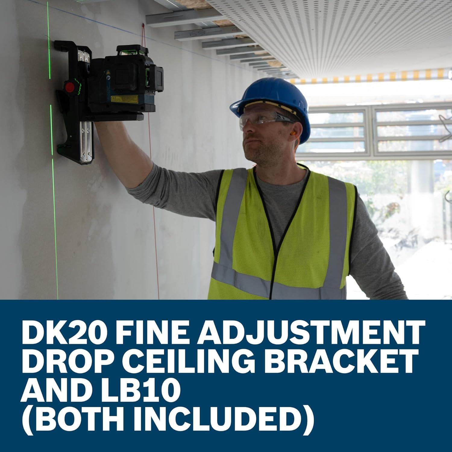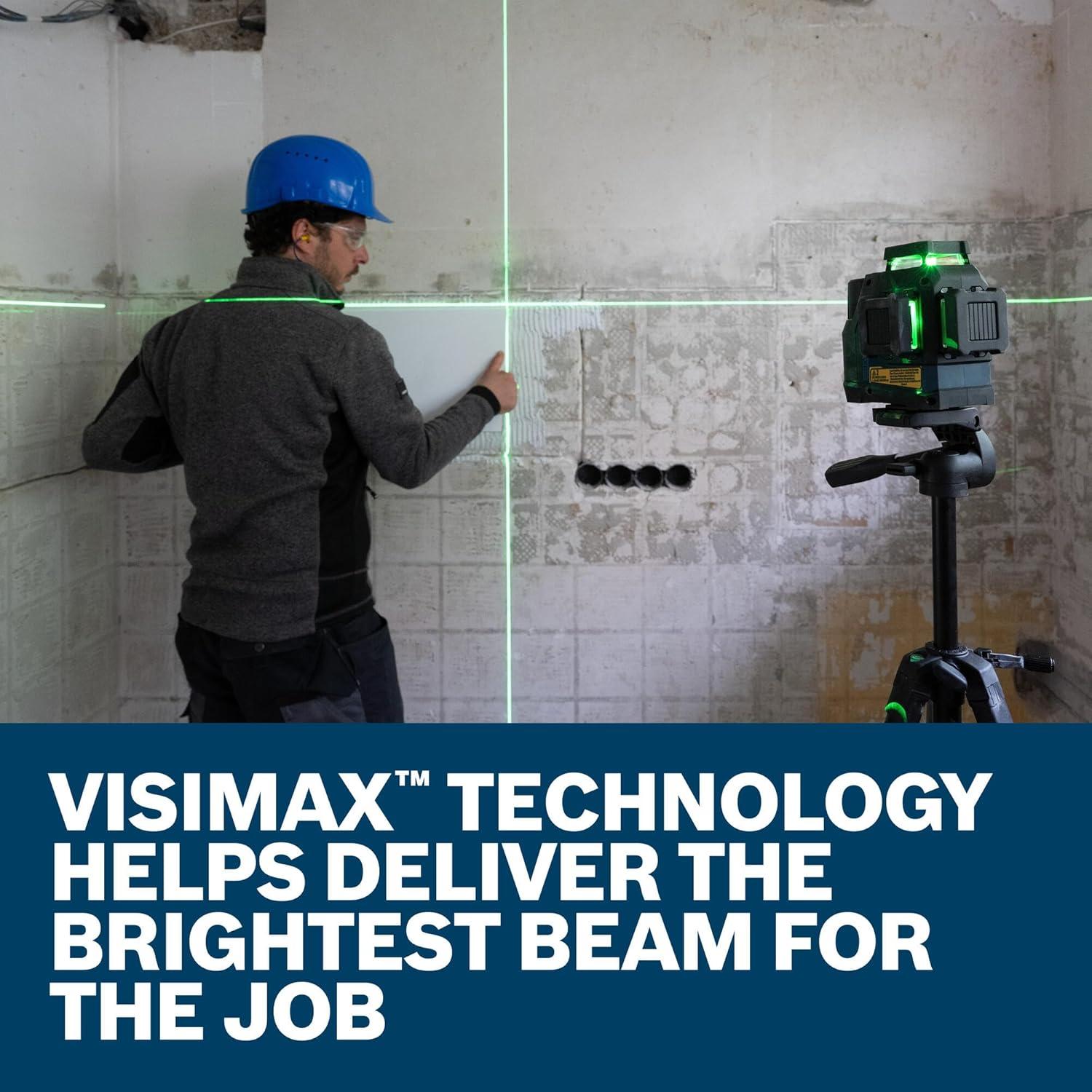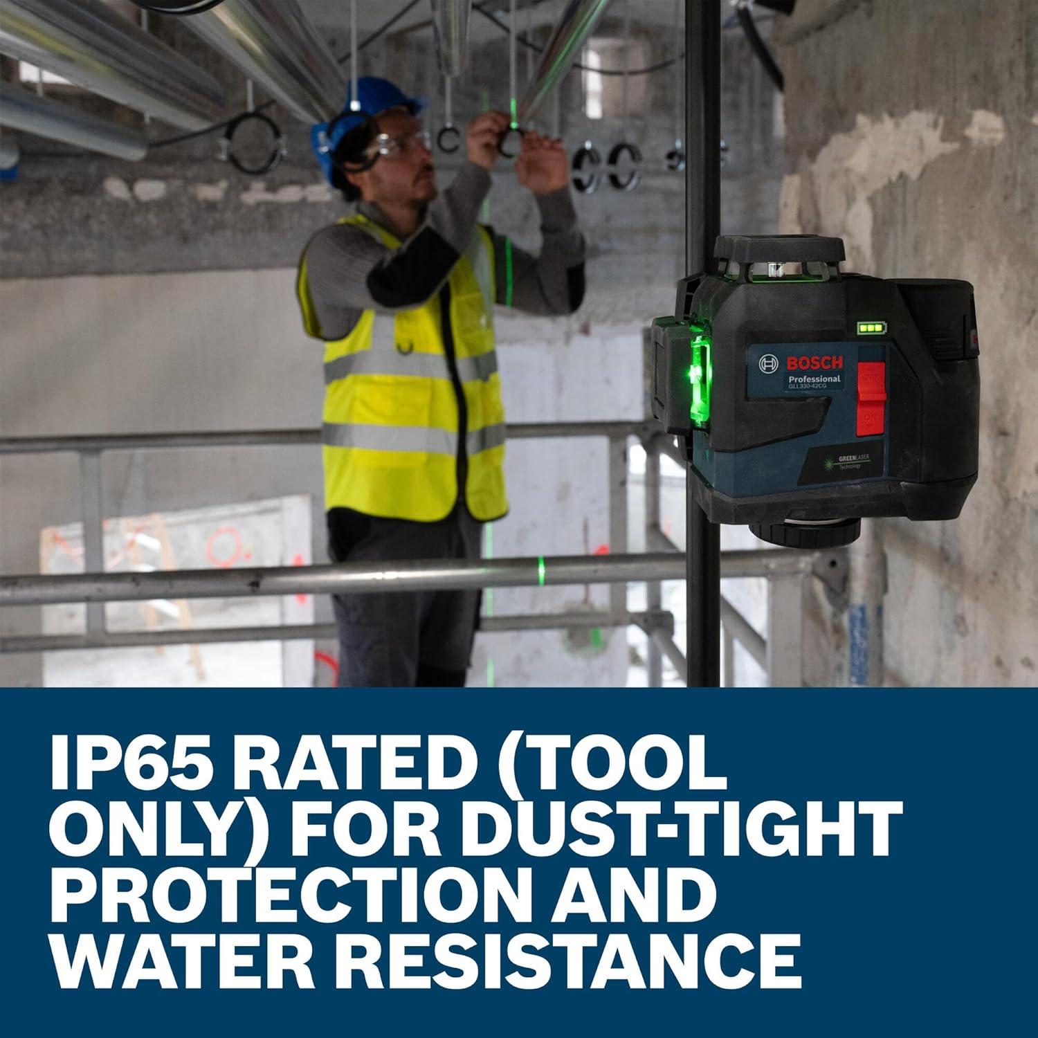 The Bosch GLL330-42CGL 12V Max 360º Connected Green-Beam Three-Plane Leveling and Alignment Laser provides an all-in-one level and alignment solution with incredible power flexibility. Use with the included rechargeable 12V Max battery or AA batteries (sold separately). Built-in VisiMax™ technology optimizes line visibility for working conditions to further enhance accuracy and battery life. The leveling laser emits three bright green-beam laser chalk lines in 360° laser planes – one horizontal and two vertical for high-visibility and fast, streamlined job setup from one initial point. Full rubber overmold housing helps protect the level at every major impact point. IP65 rated (tool only) for dust-tight and water-resistant durability in tough jobsite conditions. With a working range of up to 100 Ft., the bright, thin lines provide an accuracy of 1/8 In. at 30 Ft. Further extend the range to 330 Ft. (measured at the horizontal line at 135º and 315º) with the level’s receiver compatibility (sold separately). Equipped with a Smart Pendulum System, the tool self-levels, will indicate any out-of-level condition and then locks when switched off for secure transport. Keep a handle on the laser with the rubber grip base and easily position using the strong magnets or ¼ In. and 5/8 In. threading mounts. Fully featured with Bluetooth® connectivity, control the setup of the laser from across the room and enable power-saving mode and brightness adjustment options help maximize runtime and battery life when paired with a smartphone and the free Bosch Leveling Remote App.