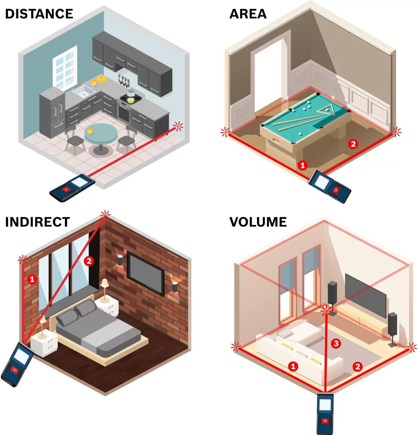 MEASURING FEATURES: The laser can calculate distance, square footage, volume and indirect measurements.