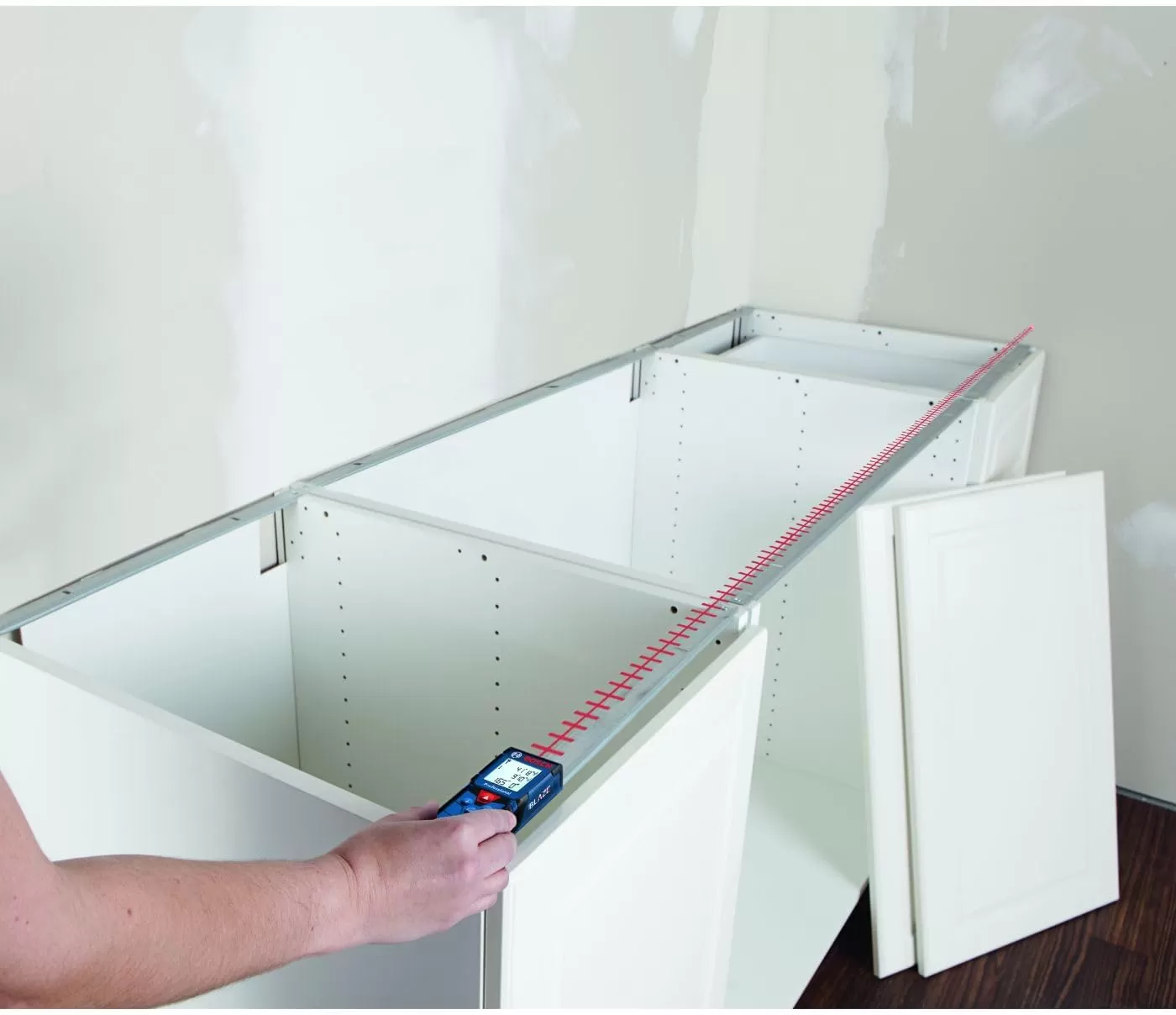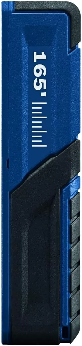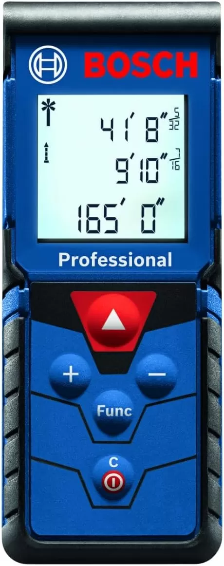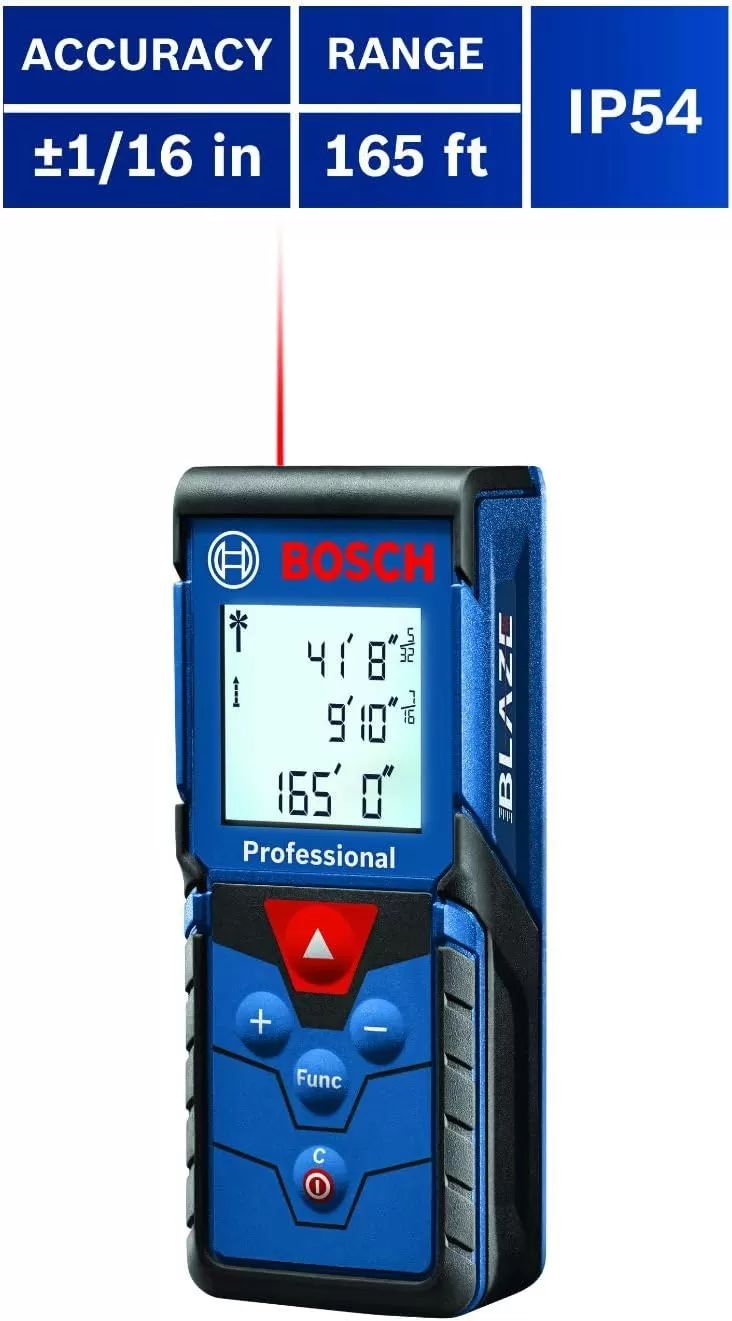 The Bosch BLAZE™ Pro GLM165-40 165 Ft. Laser Measure is a fully featured yet simple-to-use tool. It provides an easy-to-read backlit display that illuminates the measurements, and it delivers distance, square footage, volume and indirect measuring functions. It has a 10-measurement storage capability. This measure has addition/subtraction functionality, so the user can add or subtract measurements. The BLAZE™ Pro includes default real-time measurement mode, adjusting the measurement the closer to or further from the target the laser measure is. It has laser precision technology and real-time measurement mode, for instant and reliable measurements up to 165 feet, to size up the job in seconds. It is accurate up to +/-1/16 inch. It fits in any pocket for easy access.