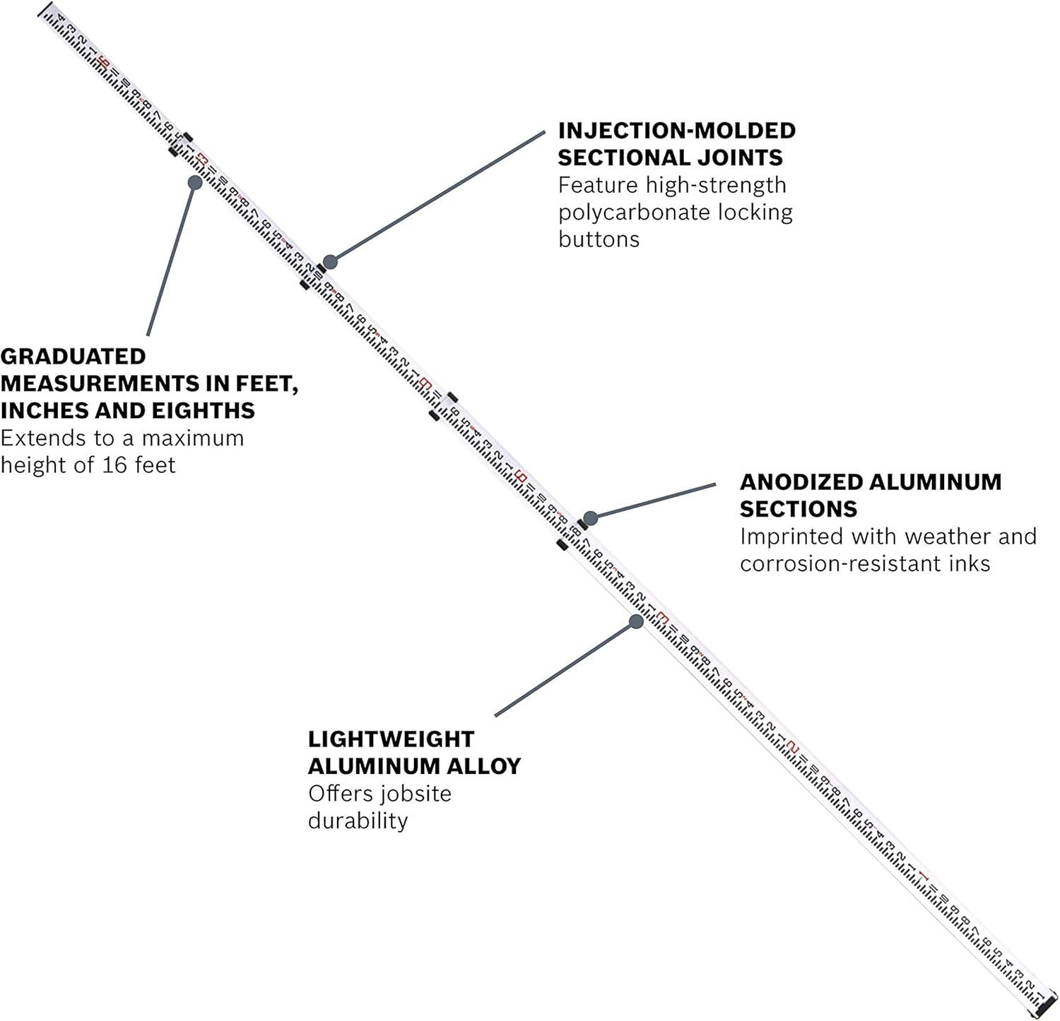 EXTENDABLE: The Bosch GR16 features a maximum extended height of 16 feet graduated in feet Inch 8ths
