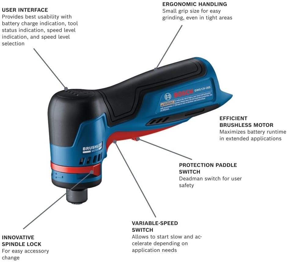 The GWG12V-20SB23 12V Max 1/4 In. Right Angle Die Grinder was engineered with both comfort and control in mind. Its multifunctional user interface allows for five speed level changes at the touch of a button. Color indicator lights provide a quick and easy way to check the battery charge, speed level and tool status while using the grinder. The variable speed trigger offers enhanced control, providing smooth, steady acceleration tailored to every application. The right angle die grinder is compact and has a small grip size, allowing for grinding even in tight quarters. Lightweight at only 1.2 Lbs. (bare tool) and ergonomic, it’s designed to help fight fatigue on the job. An innovative spindle lock facilitates swift accessory swaps, keeping downtime to a minimum. The grinder is equipped with overload protection that turns the tool off if it gets into a bind. The kit includes a charger and two 3 Ah batteries to keep the angle grinder up and running, as well as a carrying bag to easily transport the grinder while on the job.