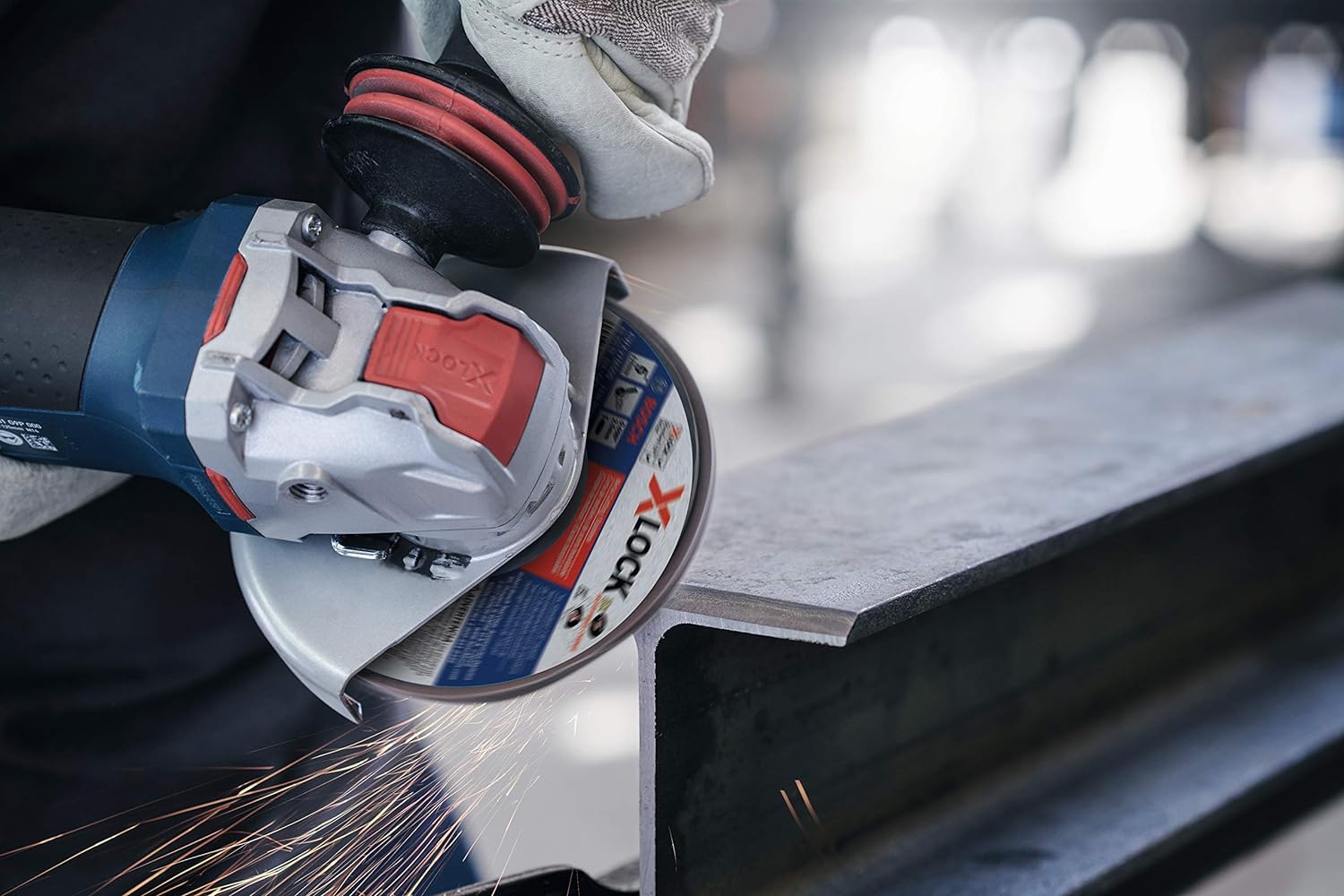 The Bosch GWX13-50 5 In. X-LOCK angle grinder features the X-LOCK mount, offering a wheel change that's up to five times faster than conventional interfaces. There’s an audible snap when mounting an X-LOCK wheel on an X-LOCK grinder. The wheel mounts properly without the need for a spanner wrench or flange nuts. The wheel is released from the grinder with the pull of a lever. The angle grinder delivers maximum power – 13 amps and 11, 500 rpm. Equipped with epoxy-coated field windings and direct-motor cooling, this grinder is built for a longer tool life. It features spiral bevel gears for smooth transmission of power. It has a Vibration Control auxiliary handle for additional user comfort and an adjustable tool-free guard.