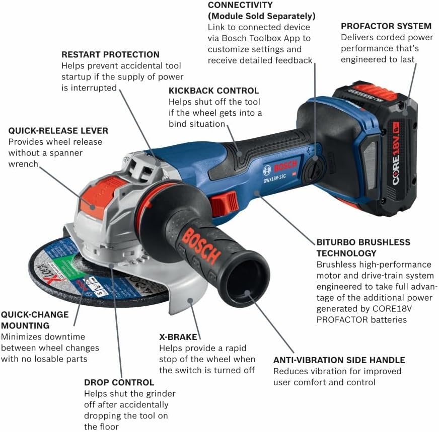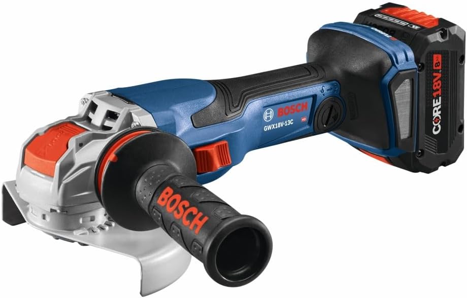 The Bosch GWX18V-13P 18V X-LOCK 5 – 6 In. Angle Grinder with Paddle Switch delivers the power to get the job done combined with the convenience of the innovative X-LOCK mount. It is the ultimate combination of performance, control and power in a cordless grinder. The X-LOCK mount offers a wheel change interface that's up to five times faster than conventional interfaces. There’s an audible snap when mounting an X-LOCK wheel on an X-LOCK grinder. The wheel mounts properly without the need for a spanner wrench or flange nuts. The wheel is released from the grinder with the pull of a lever. This tool is part of the PROFACTOR™ System, which pairs BITURBO Brushless™ Technology with a CORE18V® High Power Battery. BITURBO Brushless™ Technology is a high-performance motor and drive-train system designed to deliver performance comparable to high-demand corded tools. The grinder includes other advanced electronics such as X-Brake, restart protection and KickBack Control. It features a multi-grip paddle switch, which provides increased grip options for better comfort and control. It also features spiral bevel gears, a narrow grip size and a two-position Vibration Control side handle. The adjustable tool-free guard is designed with multiple fixed-adjustment settings to allow the user to position the guard in a variety of working angles. The kit includes a CORE18V® 8 Ah High Power Battery, which delivers 50% more runtime and over 75% more power than the CORE18V® 4 Ah battery, powering high-demand applications.
