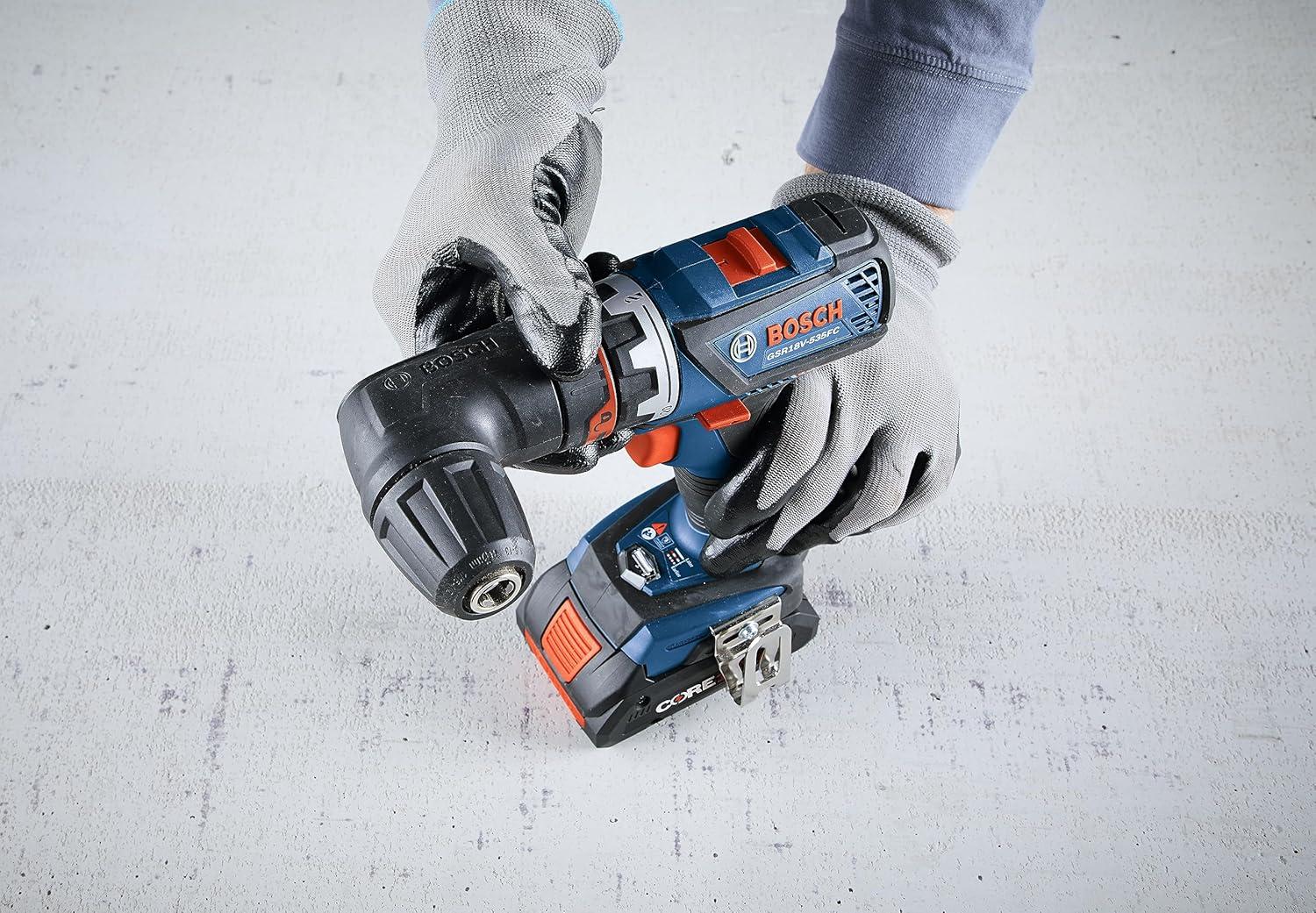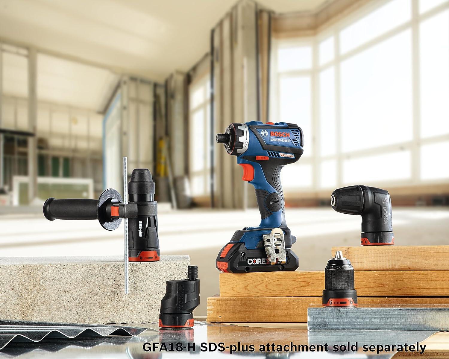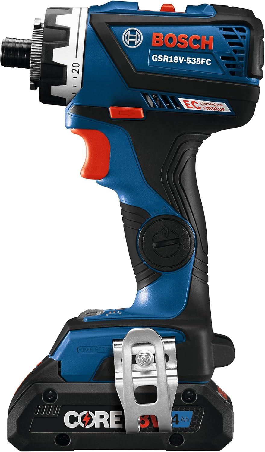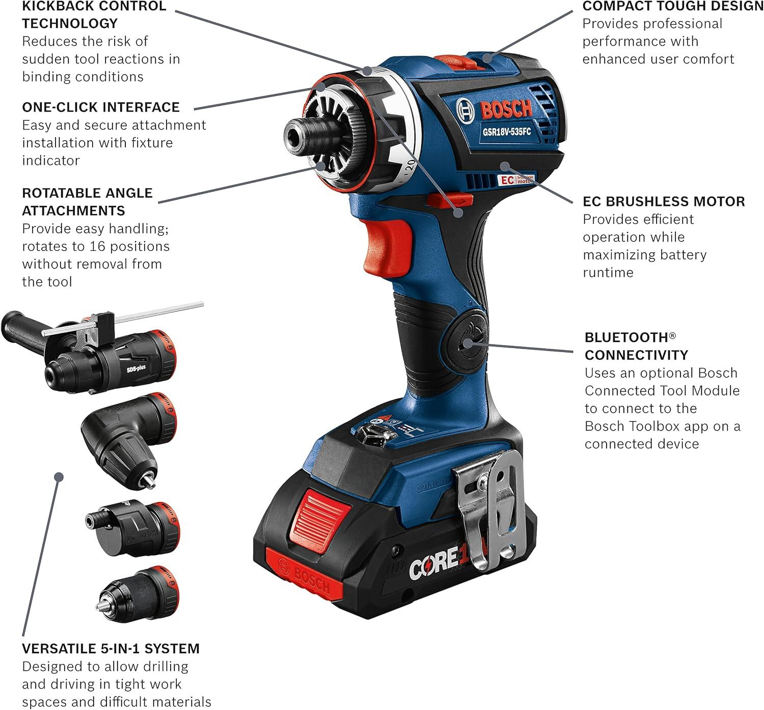 The Bosch GXL18V-270B22 18V Two-Tool Combo Kit features two brushless tools combining maximum on-the-job flexibility with professional power. The GSR18V-535FC Drill/Driver delivers up to 535 In.-Lbs. of torque and has the 5-In-1 Flexiclick® System. It has a 1/4 In. hex bit holder with quick release. The Flexiclick® System includes three pro-grade attachments: a right-angle chuck, an offset hex bit holder and a 1/2 In. keyless metal chuck attachment. Users may also add an optional rotary hammer adapter (not included). The drill/driver features connectivity (module sold separately), KickBack Control and a precision clutch. The GOP18V-28 StarlockPlus® Oscillating Multi-Tool has the Starlock® next-generation 3-D tool-accessory interface, for outstanding accessory grip and greater torque transfer. It has a no-touch blade-change system. The brushless motor has a top speed of up to 20,000 oscillations per minute, and the tool provides a 2.8° oscillating arc. It has Constant Response circuitry, a variable-speed dial and an LED light. The kit includes a CORE18V® 4 Ah Advanced Power Battery, an 18V 2 Ah Standard Power Battery and an 18V charger.