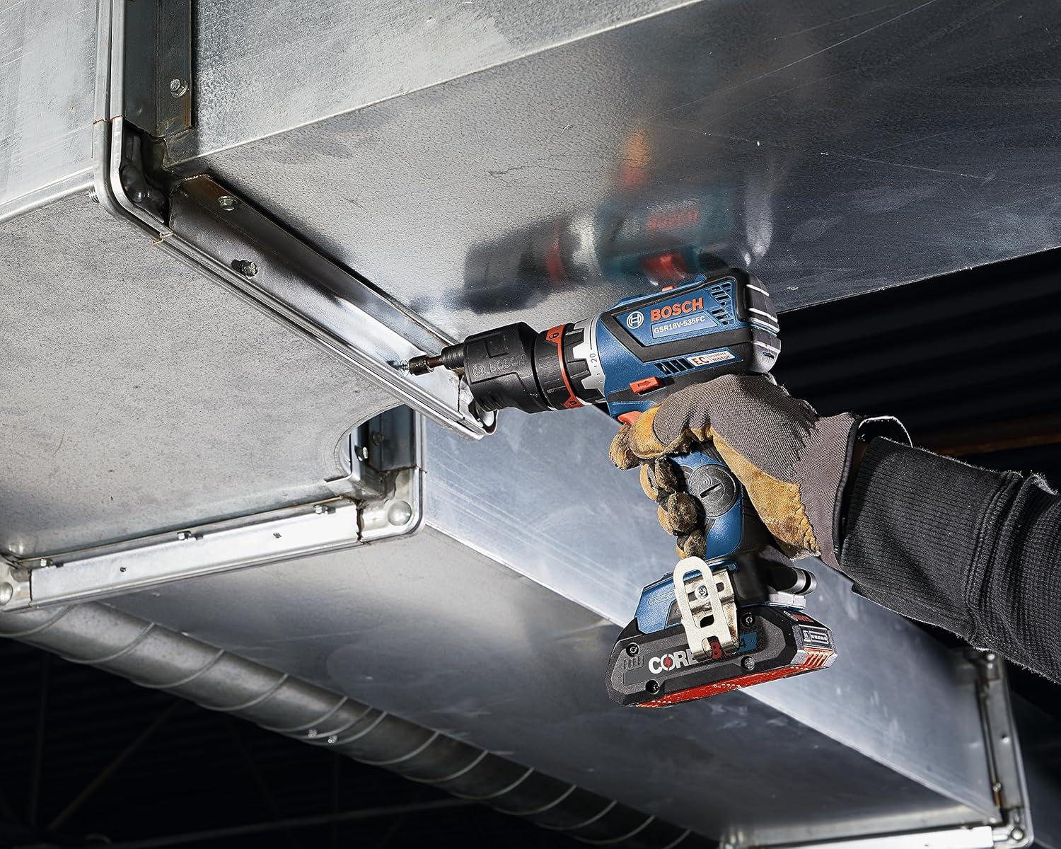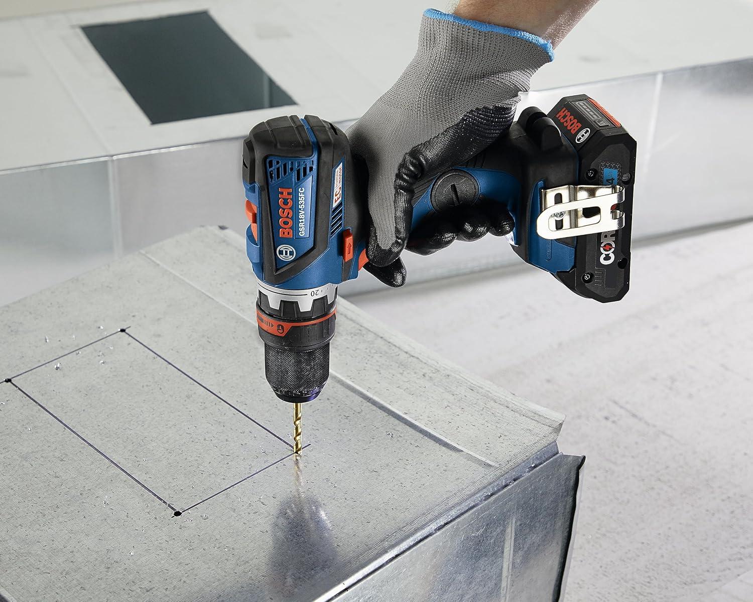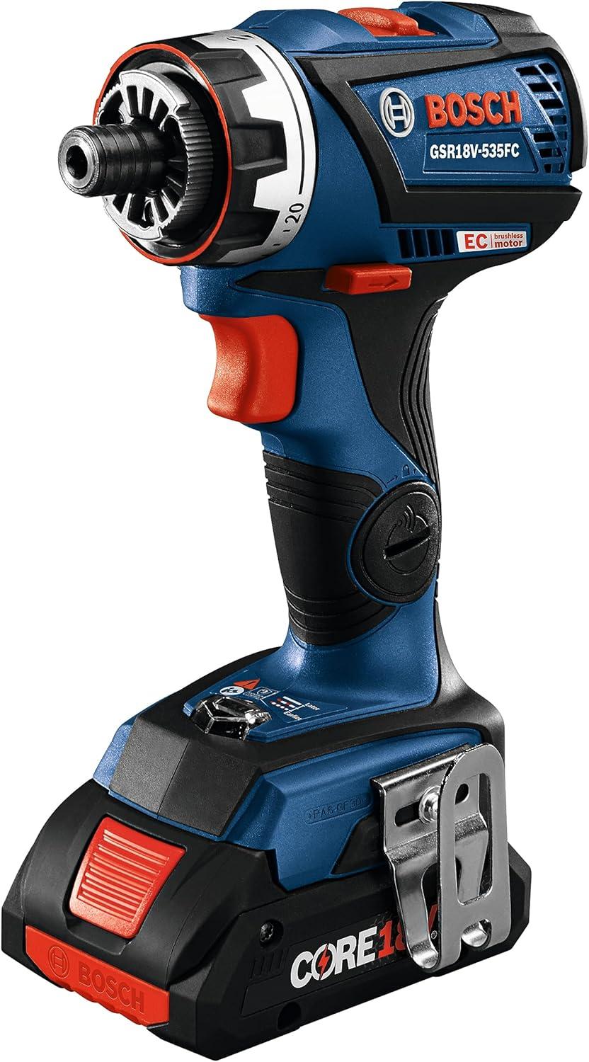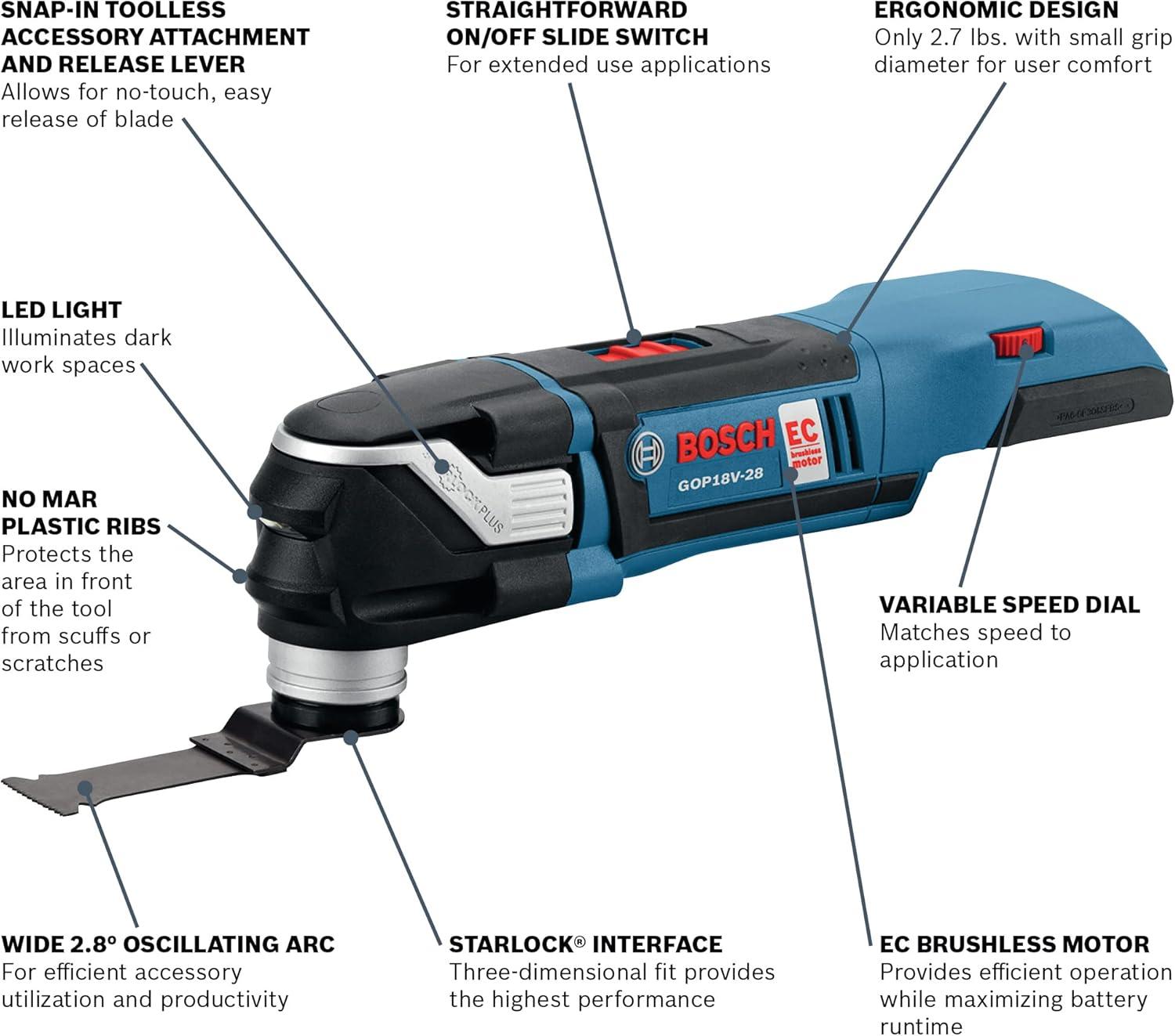 The Bosch GXL18V-270B22 18V Two-Tool Combo Kit features two brushless tools combining maximum on-the-job flexibility with professional power. The GSR18V-535FC Drill/Driver delivers up to 535 In.-Lbs. of torque and has the 5-In-1 Flexiclick® System. It has a 1/4 In. hex bit holder with quick release. The Flexiclick® System includes three pro-grade attachments: a right-angle chuck, an offset hex bit holder and a 1/2 In. keyless metal chuck attachment. Users may also add an optional rotary hammer adapter (not included). The drill/driver features connectivity (module sold separately), KickBack Control and a precision clutch. The GOP18V-28 StarlockPlus® Oscillating Multi-Tool has the Starlock® next-generation 3-D tool-accessory interface, for outstanding accessory grip and greater torque transfer. It has a no-touch blade-change system. The brushless motor has a top speed of up to 20,000 oscillations per minute, and the tool provides a 2.8° oscillating arc. It has Constant Response circuitry, a variable-speed dial and an LED light. The kit includes a CORE18V® 4 Ah Advanced Power Battery, an 18V 2 Ah Standard Power Battery and an 18V charger.