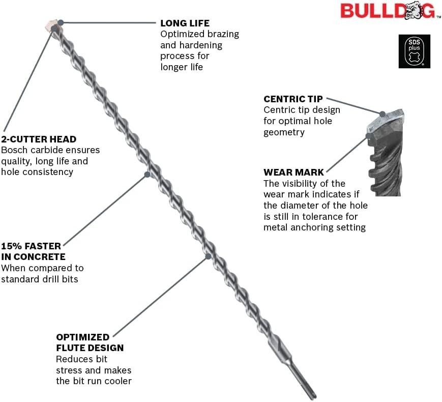 FOR USE: Use with SDS-Plus rotary hammers, delivering optimal hole geometry in a variety of applications including concrete, brick, block and more