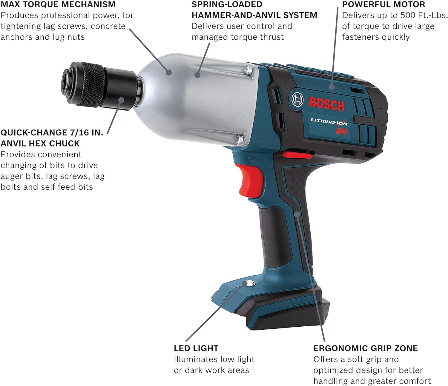 The BOSCH HTH182-B25 18V High-Torque Impact Wrench Kit includes an industrial-duty impact wrench with a 7/16 In. hex chuck. It was engineered for concrete contractors, auto pros, carpenters and other pros who spend a great deal of time fastening high-torque nuts and anchors, such as lag screws or lug nuts. It provides professional cordless torque, delivering up to 500 Ft. -Lbs. The cordless tool provides a 7/16 In. hex quick-change anvil for fast changing of bits. The all-metal motor generates 0-2, 100 ipm and 0-1, 900 rpm. This impact wrench has a spring-loaded hammer-and-anvil system that controls torque reaction to allow for easier impact-driving power. The kit includes two next-gen CORE18V 4. 0 Ah compact batteries. Each keeps the power and runtime, while losing the weight, with 21700 cell technology. The CORE18V matches the power of the original two-layer 4. 0 Ah battery with half the number of cells. It features the Cool Pack 2. 0 heat-management system.