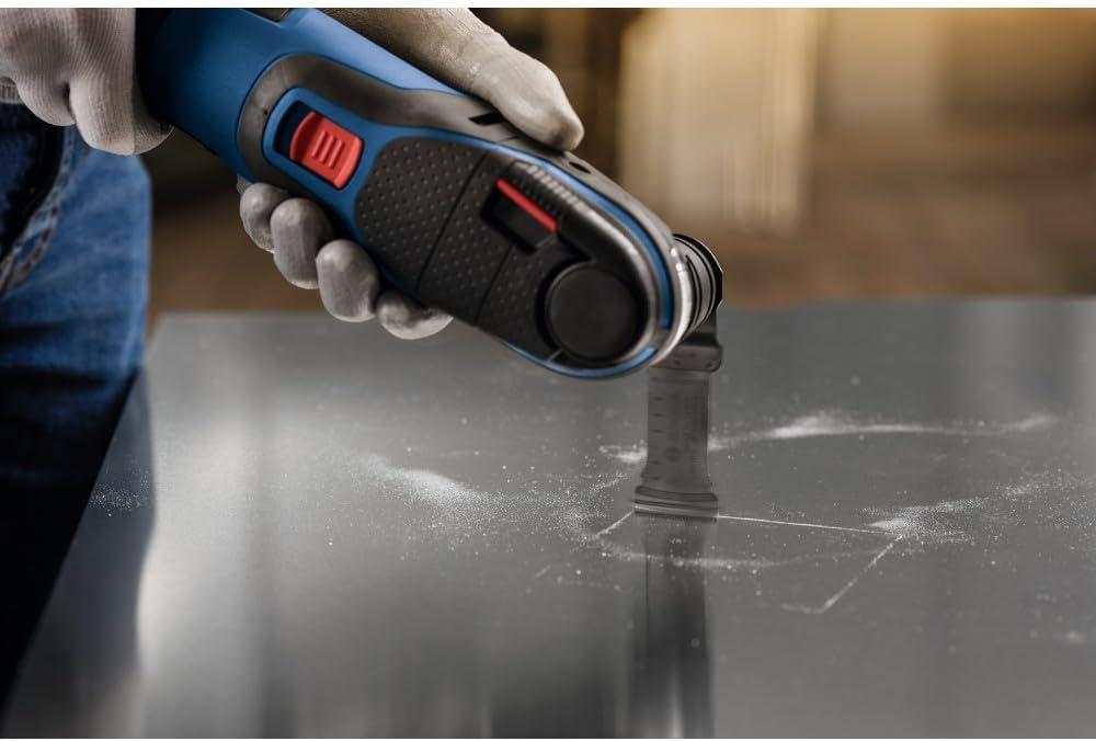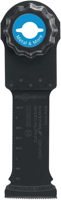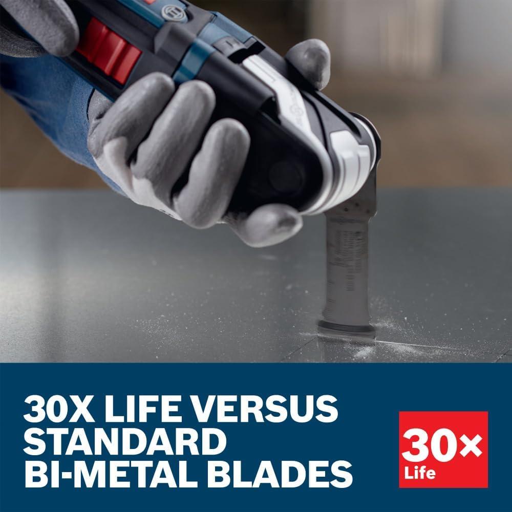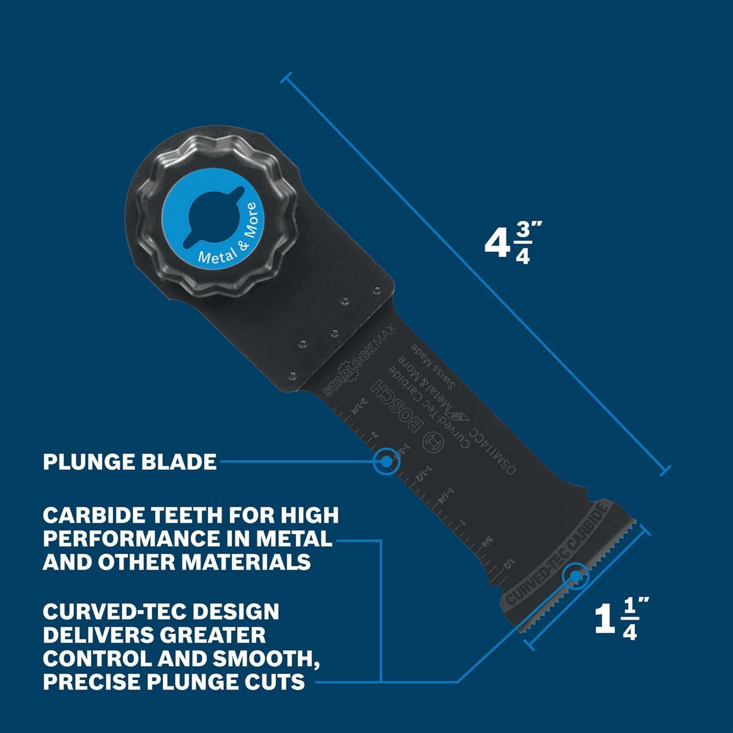 The Bosch Curved-Tec Carbide Extreme Plunge Blade provides professional, long-lasting performance cutting metal (nails and staples), wood with nails, drywall, PVC and other materials. The Curved-Tec design features a rounded edge for precise control during plunge cuts. The carbide teeth provide 30X life compared to standard bi-metal plunge blades. The reinforced tapered bodies reduces vibrations and blade flex, and provides less jamming and smoother cuts. Starlock® accessories deliver a three-dimensional blade grip to deliver higher torque transfer, reduced vibration and professional performance. All blades feature a three-second no-touch quick change interface with Starlock® multi-tools. StarlockMax® accessories are engineered to be compatible exclusively with StarlockMax® multi-tools due to the power requirements required to drive the blades. Color-coded interface and laser-etched blade designed to allow user to quickly identify the right blade. Heavy-duty professional-grade Swiss-made blade manufactured with premium materials and innovative engineering.