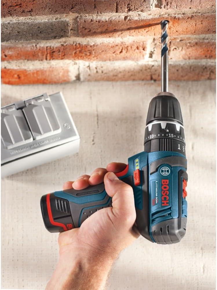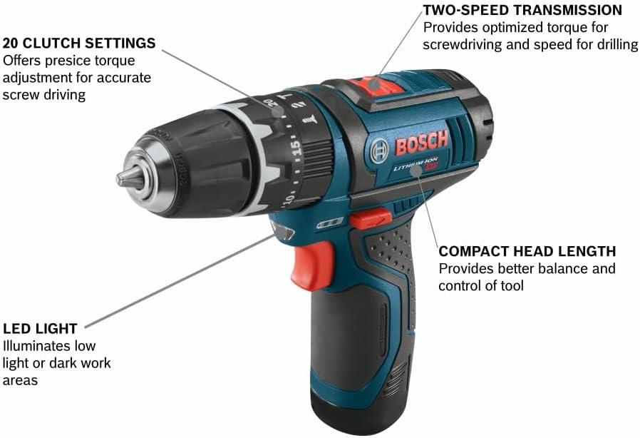 This 12V Max 3/8 In. hammer drill/driver is a professional-grade tool that provides real power at an unreal size. The Bosch PS130 features a professional motor that delivers 265 In.-Lbs. of torque, along with a max speed of 1,300 rpm. It has an impact rate of 19,500 bpm for a variety of applications. With a head length of 8.0 In. and a weight of 1.9 Lbs. (tool only, not including battery), this compact powerful hammer drill/driver is an ideal tool for overhead work or tight spaces. The 3/8 In. keyless chuck provides enhanced bit grip. It provides two-speed transmission and 20+1 clutch settings, for more precise operation. It has an LED light to illuminate dark work areas. This is a bare tool kit; the battery and charger are sold separately.