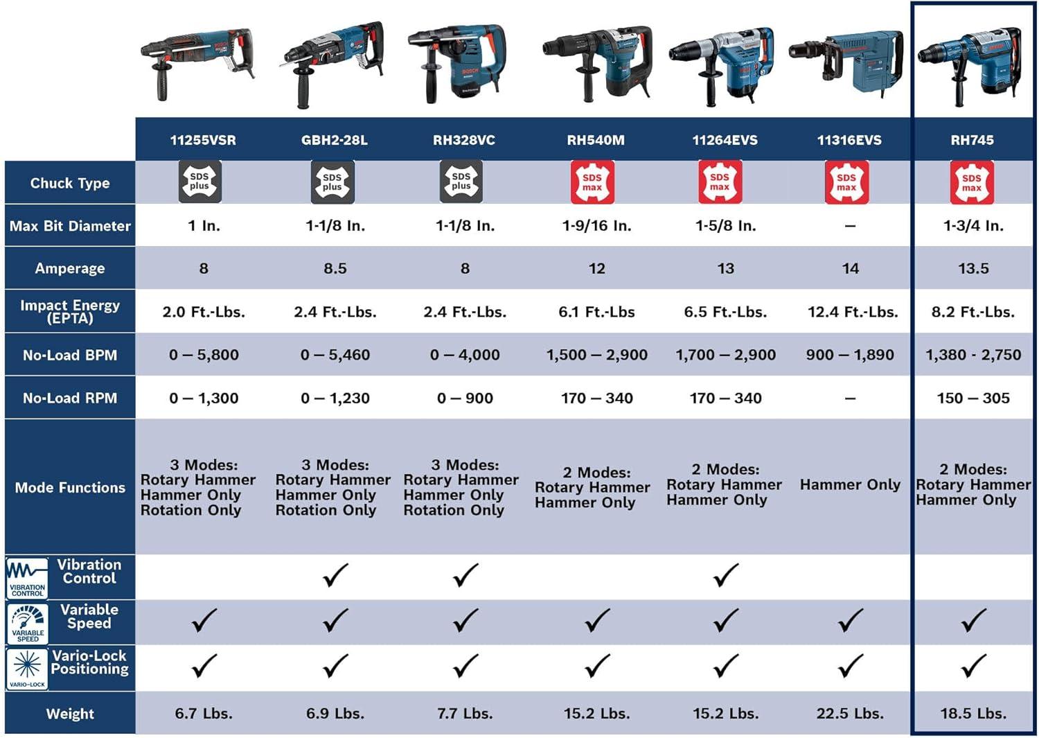 The Bosch RH745 SDS-max® 1-3/4 In. rotary hammer features best in class drilling and chiseling performance with 8.2 Ft.-Lbs. Impact energy (EPTA). The hammer features two modes of operation. Rotary hammer or hammer-only and a variable speed dial for controlled drilling and chiseling applications. The tool also features the Vario-Lock function. This allows the chisel to be rotated into 12 different positions to optimize the working angle when used in hammer only mode.