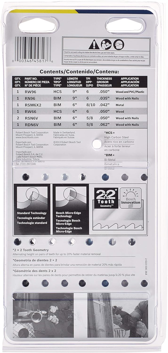 The BOSCH All-Purpose Reciprocating Saw Blade Set features blades made with bi-metal and high carbon steel construction, delivering maximum life and durability in heavy use. These blades feature teeth that are optimized for cutting efficiency. The kit features a variety of blades designed for key professional applications. The blades will tackle wood, wood with nails, metal, drywall, plastic and PVC and more. These recip blades feature precision-ground teeth designed for fast cutting, high performance and staying sharp longer. By incorporating high-quality materials, best manufacturing processes and proven tooth-design features, BOSCH provides professional reciprocating saw blades that cut faster and last longer.