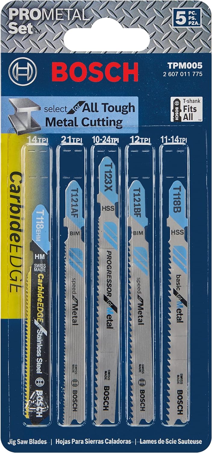 Set also includes a bi-metal Progressor for All Purpose blade, which is flexible and tough for fast cuts and longer life in a variety of materials. Bosch bi-metal jig saw blades last twice as long as HSS blades and 10 times longer than HCS blades.