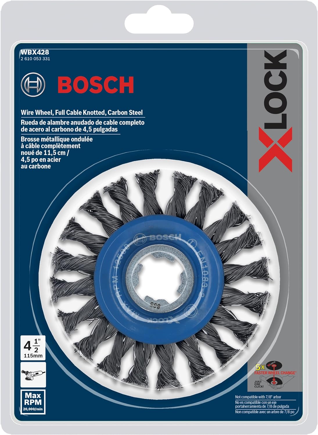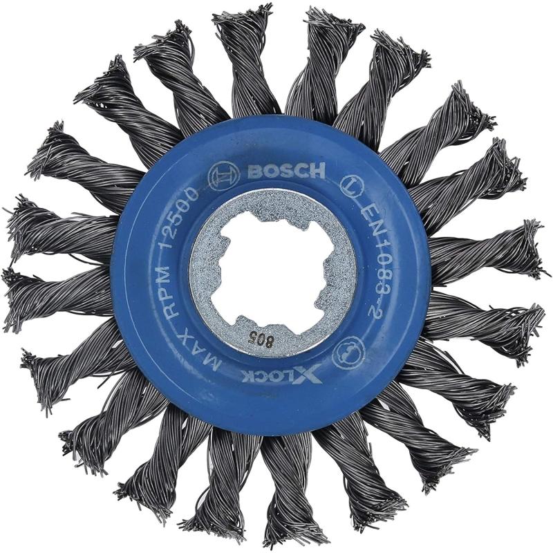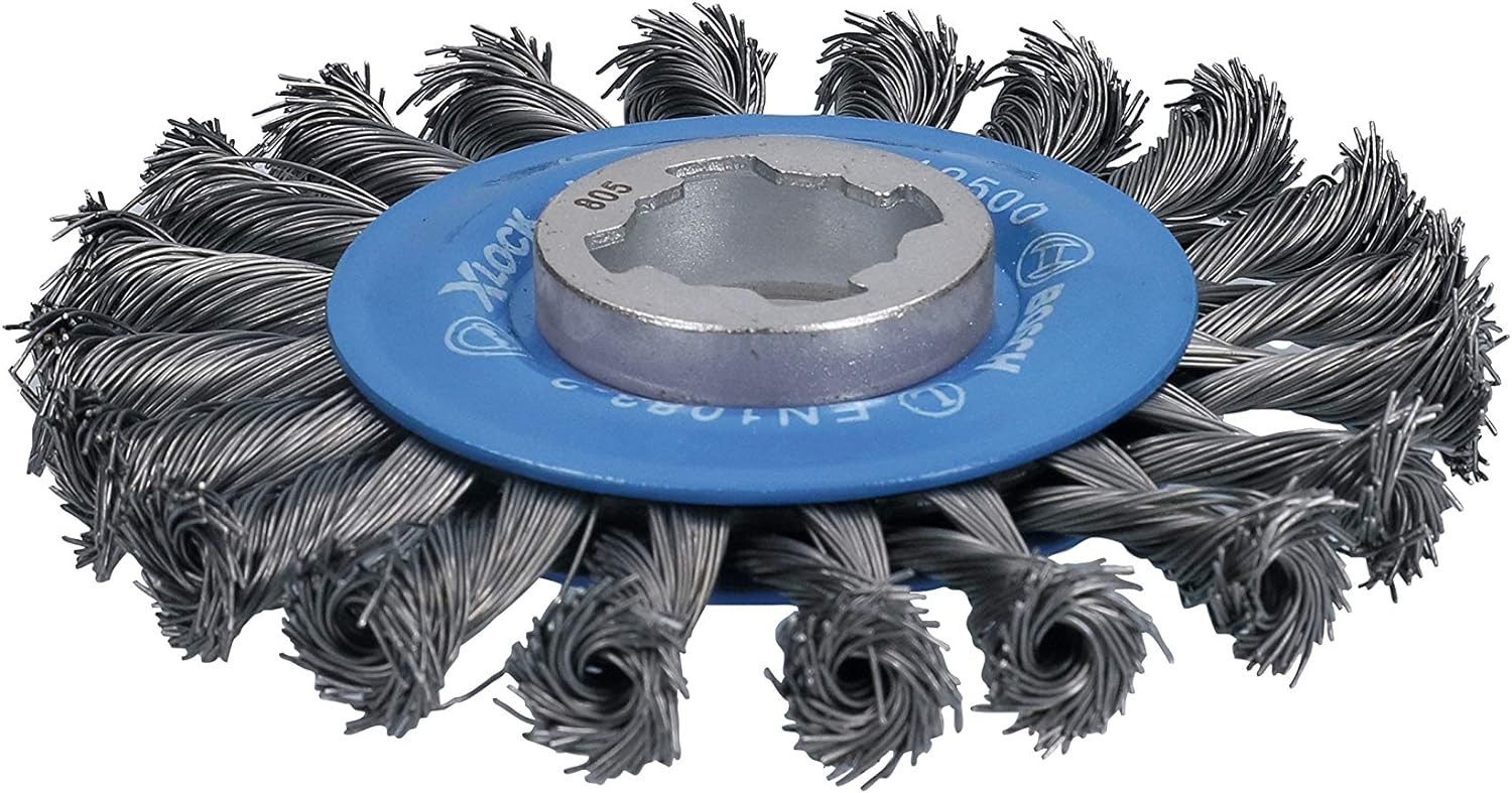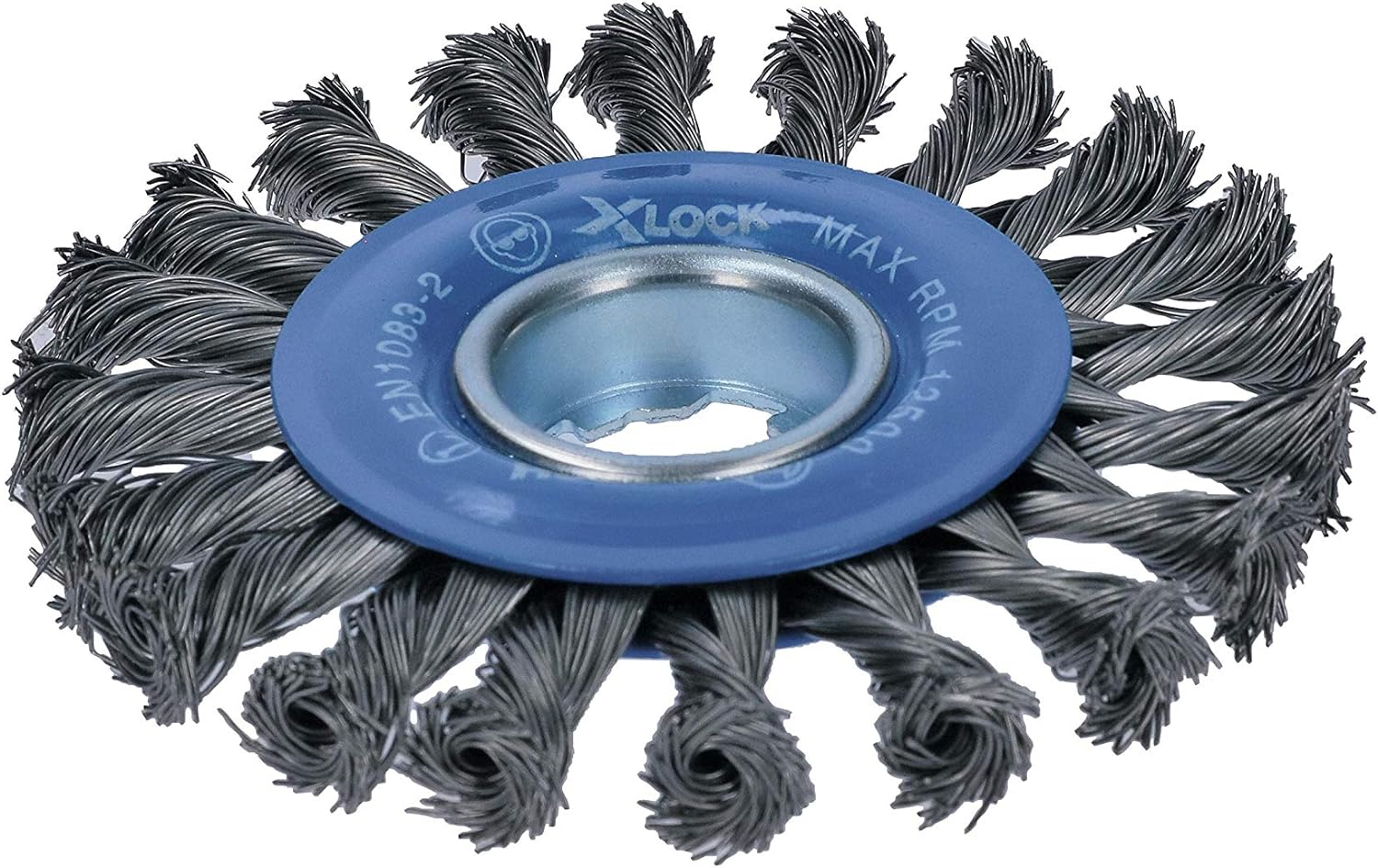 Bosch's X-LOCK Wire Wheels feature the X-LOCK mount and offer a wheel change that's up to five times faster than conventional interfaces. There’s an audible snap when mounting an X-LOCK Wheel on an X-LOCK grinder. The wheel mounts properly without the need for a spanner wrench or flange nuts. The wheel is released from the grinder with the pull of a lever. This high-quality crimped tempered steel features maximum wire density for long life, to de-burr gears, remove oxides, scale, flash, and for edge blending. Bosch cable-knotted, stringer bead and crimped wire wheels are ideal for deburring metal, bead weld prep, cleaning welds, edge blending and more. The precision-balanced wheel and robust construction allows for professional applications.