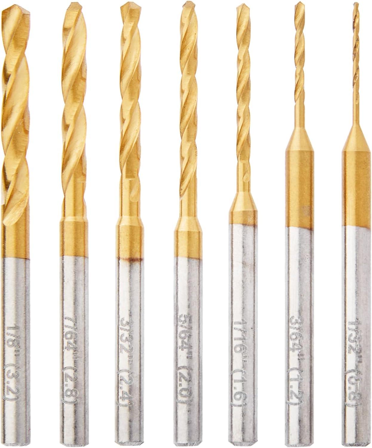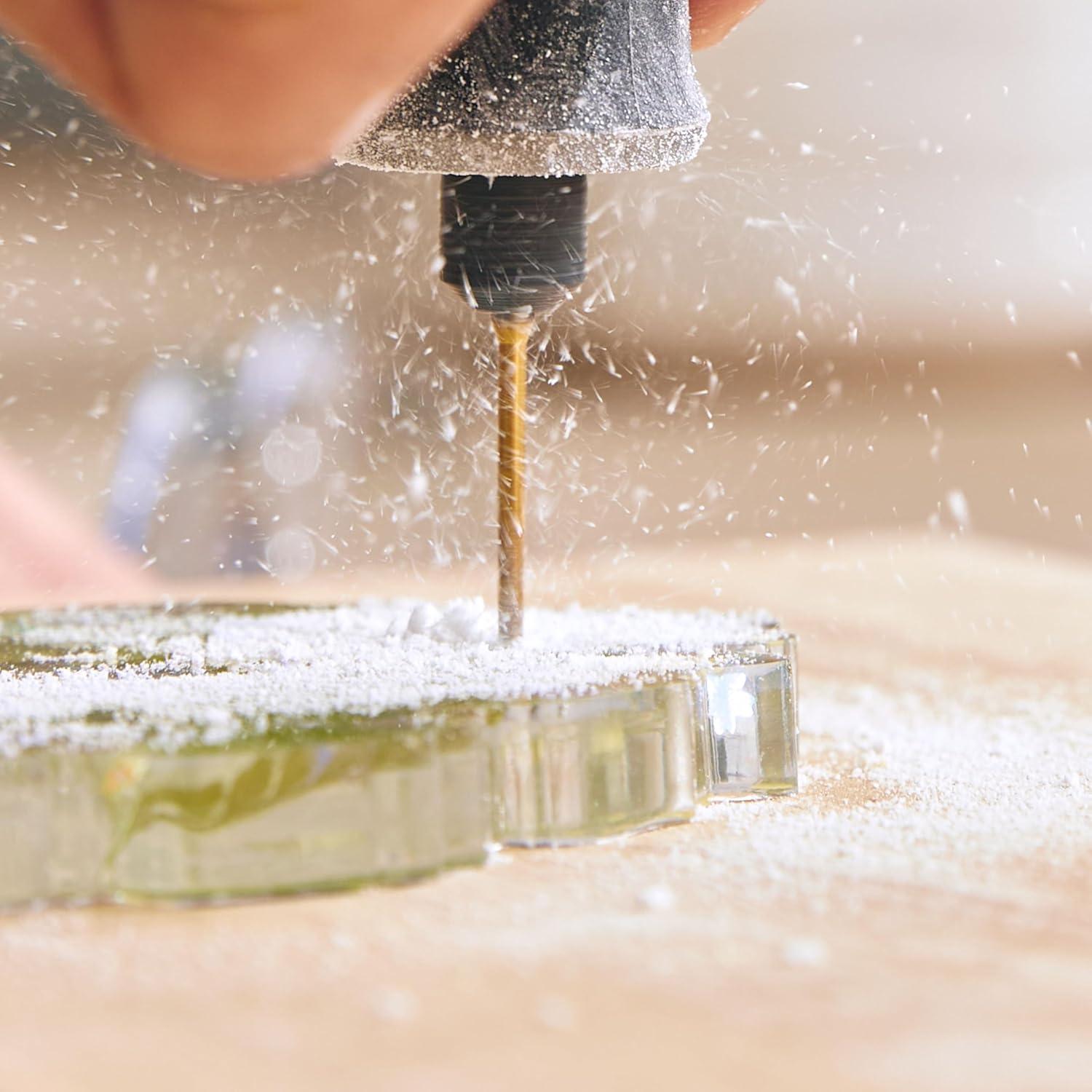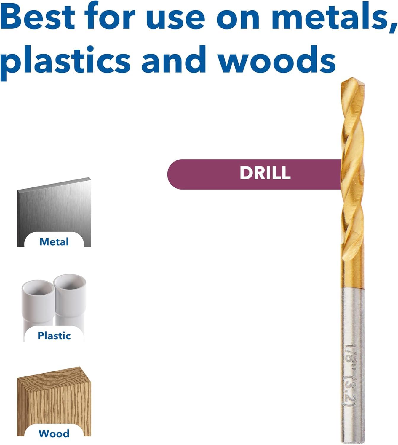 Our set includes seven drill bits, titanium-coated for optimal performance in wood, plastics, soft metals, and drywall. The set includes various sizes: 1/32, 3/64, 1/16, 5/64, 3/32, 7/64, and 1/8 inches. Crafted from high-grade stainless steel and finished with a high-quality titanium coating, these accessories are designed for enhanced durability. Each bit is conveniently standardized to a 1/8″ shank diameter, allowing for versatile use across multiple drilling diameters. For optimal results, we recommend using these drill bits with Dremel rotary tools capable of achieving speeds of 20,000 RPM or higher. Please click here to see the recommended speed settings for our accessories.