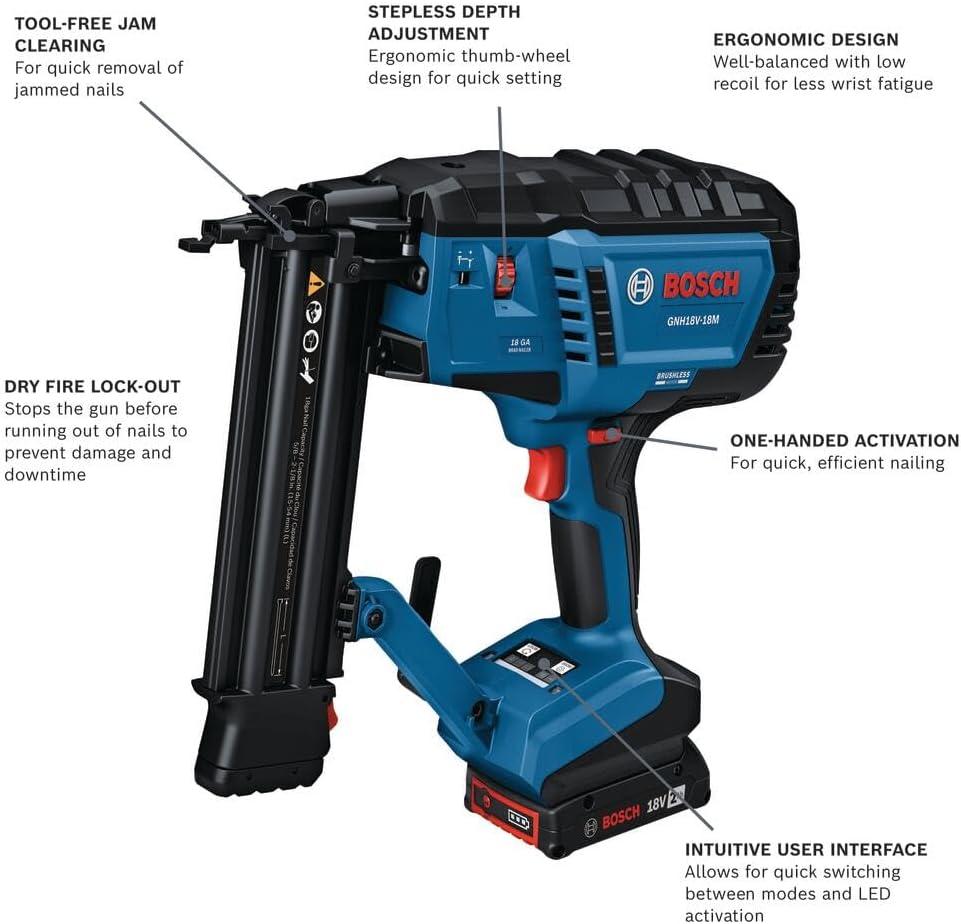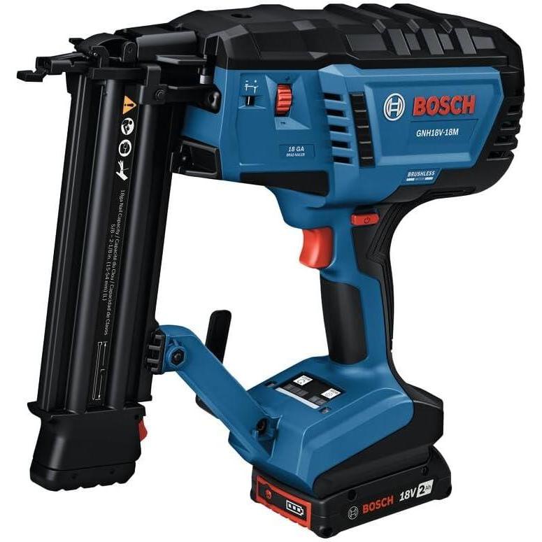 The Bosch GTH18V-18M 18V Brushless 18-gauge Narrow Crown Stapler delivers power and precision in a cordless solution. Experience uninterrupted productivity while navigating tight spaces and hard-to-reach areas by eliminating the hassle of compressors and hoses. The efficient, brushless motor delivers the power to consistently sink 18-gauge narrow crown staples ranging from 3/8” In. to 1-½ In. which makes it ideal for furniture and upholstery applications, cabinetry, and flooring underlayment. The 18-gauge narrow crown stapler has a magazine capacity of 110 staples. When paired with a CORE18V 4 Ah battery (Kit includes 2Ah battery; 4 Ah battery sold separately), it can fasten up to 1,800 staples per charge, ensuring extended productivity. One-handed activation simplifies the process for quick and hassle-free fastening, catering to both right- and left-handed users. A double LED light illuminates the work area for more precise and efficient fastening. The dry-fire lockout feature automatically stops operation when down to the last five staples. This not only prevents blank firing but also safeguards the workpiece from potential damage. Make easy and precise adjustments to the depth setting with the ergonomic thumb wheel. Additionally, downtime is minimized as jammed staples can be quickly cleared through a tool-free release mechanism while on the job. An intuitive user interface allows for easy toggling between single and bump-fire modes, turns the LED light on and off, and informs the worker of scheduled maintenance of the tool. An integrated heavy-duty belt hook provides easy portability and storage between tasks. The kit features a standard 18V 2 Ah Battery and 18V Standard Battery Charger.